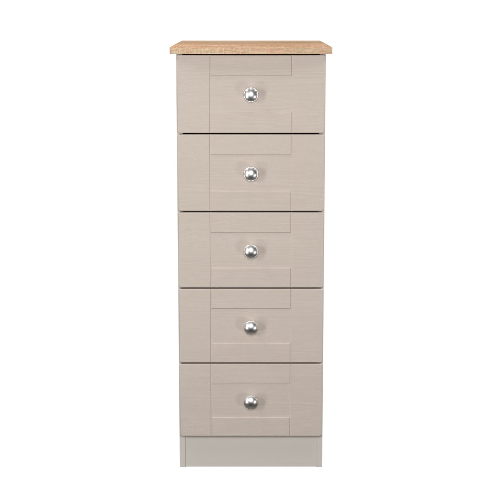 This 5 drawer chest of drawers is practical and stylish. Perfect for any home as a free standing storage unit. Wood grain effect, panelled design, recessed fronts, contrasting wood top and chrome handles, this traditional Range is a beautifully elegant collection. With this range you have the freedom to choose from a wide range of furniture configurations, allowing you to create the perfect combination to optimise your storage space. All our furniture is made to order in the United Kingdom, to the highest quality. It is delivered within 10 working days direct to your location of choice by one of our two man delivery teams, and comes fully assembled - Please Note that any handles or legs may be removed durning transit to avoid the risk of damage. Part of the Sussex Collection.