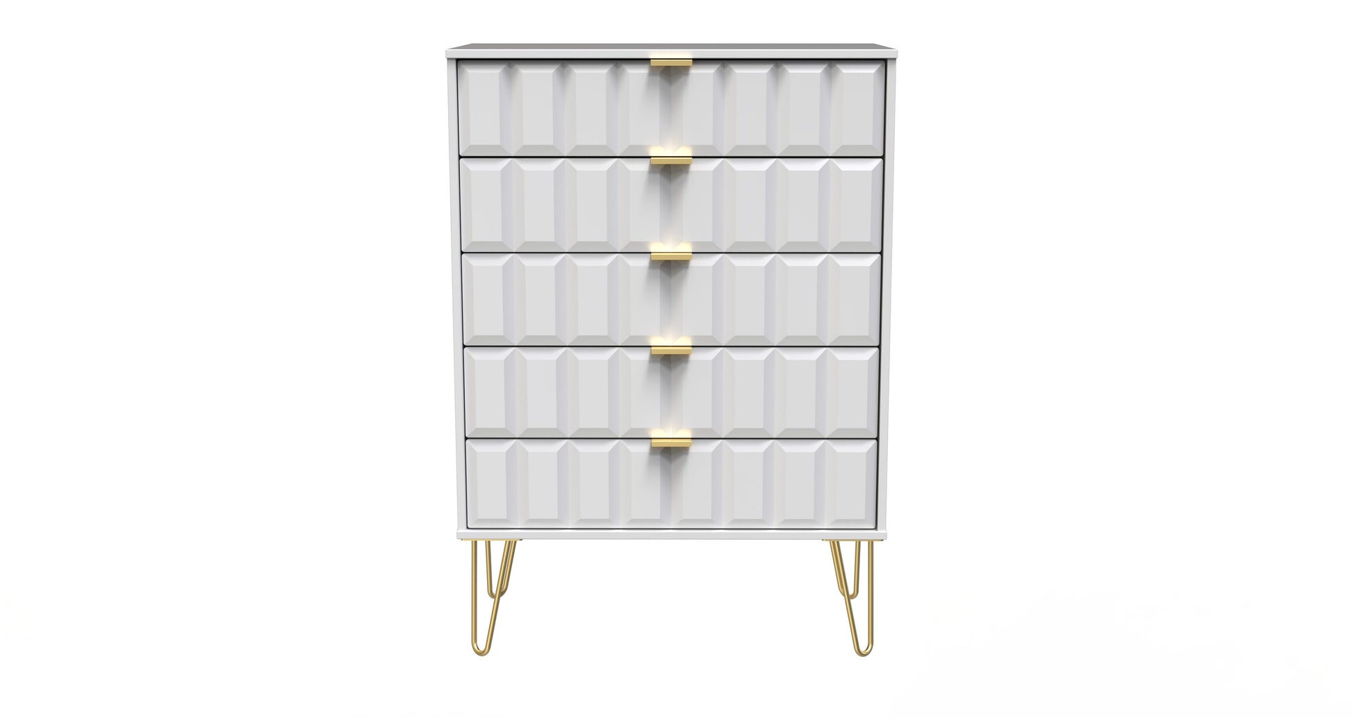 This wide 5 drawer chest of drawers is practical and stylish. Perfect for any home as a free standing storage unit. A modern and distinctive range. This ranges unique aesthetic is best represented by the distinctive "Cube" patten of the drawer and door fronts. Also features Gold Metal Handles and Gold Hairpin Legs. Comes in a wide range of colours including eye cathching two tone colour combinations. All our furniture is made to order in the United Kingdom, to the highest quality. It is delivered within 10 working days direct to your location of choice by one of our two man delivery teams, and comes fully assembled (although legs may be removed to prevent damage in transit). Part of the Cube Collection.
