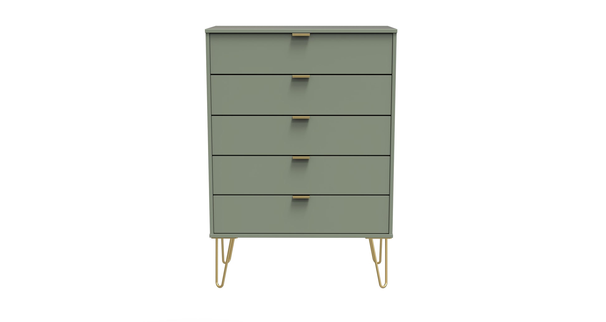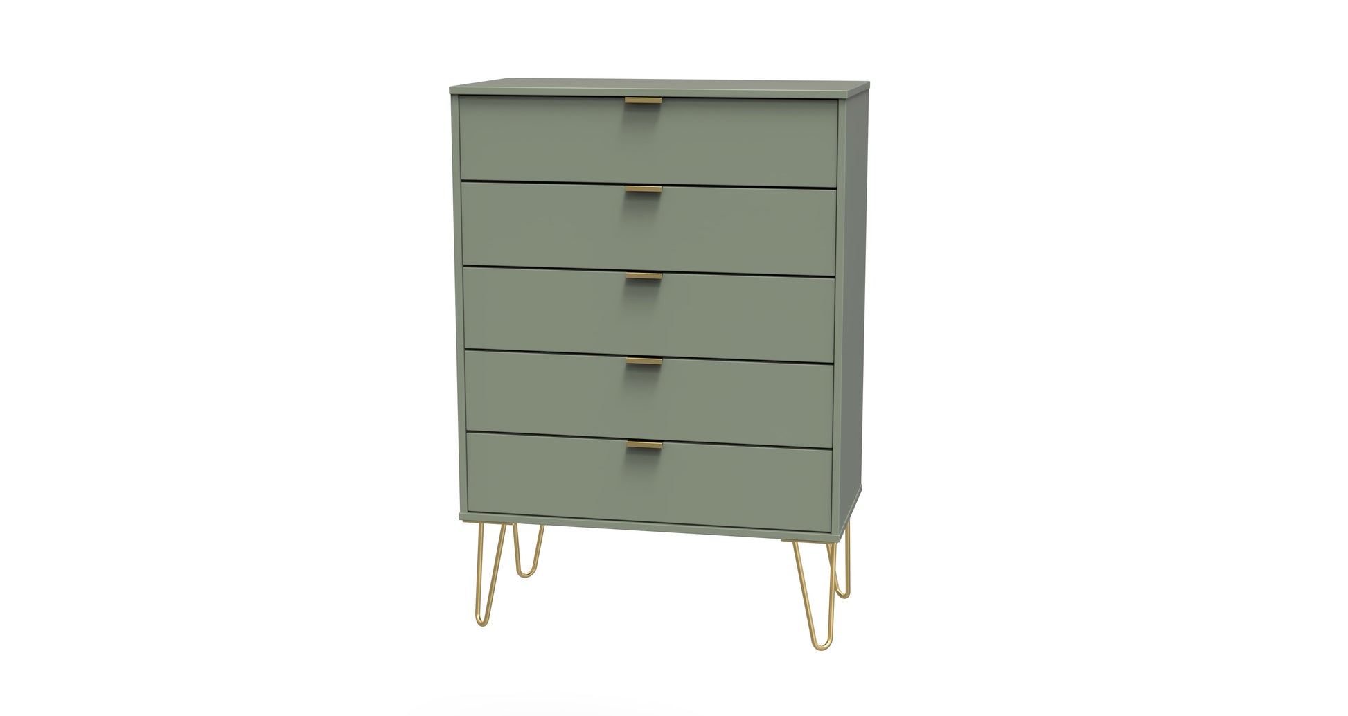This wide 5 drawer chest of drawers is practical and stylish. Perfect for any home as a free standing storage unit. Modern and stylish, this striking range is available in a range of durable scratch resistant colour or natural wood finishes. With pull handles on all doors and drawers, with gold hairpin metal legs. Comes with Soft Close Drawers. All our furniture is made to order in the United Kingdom, to the highest quality. It is delivered within 10 working days direct to your location of choice by one of our two man delivery teams, and comes fully assembled (although legs may be removed to prevent damage in transit). Part of the Hong Kong F Collection.