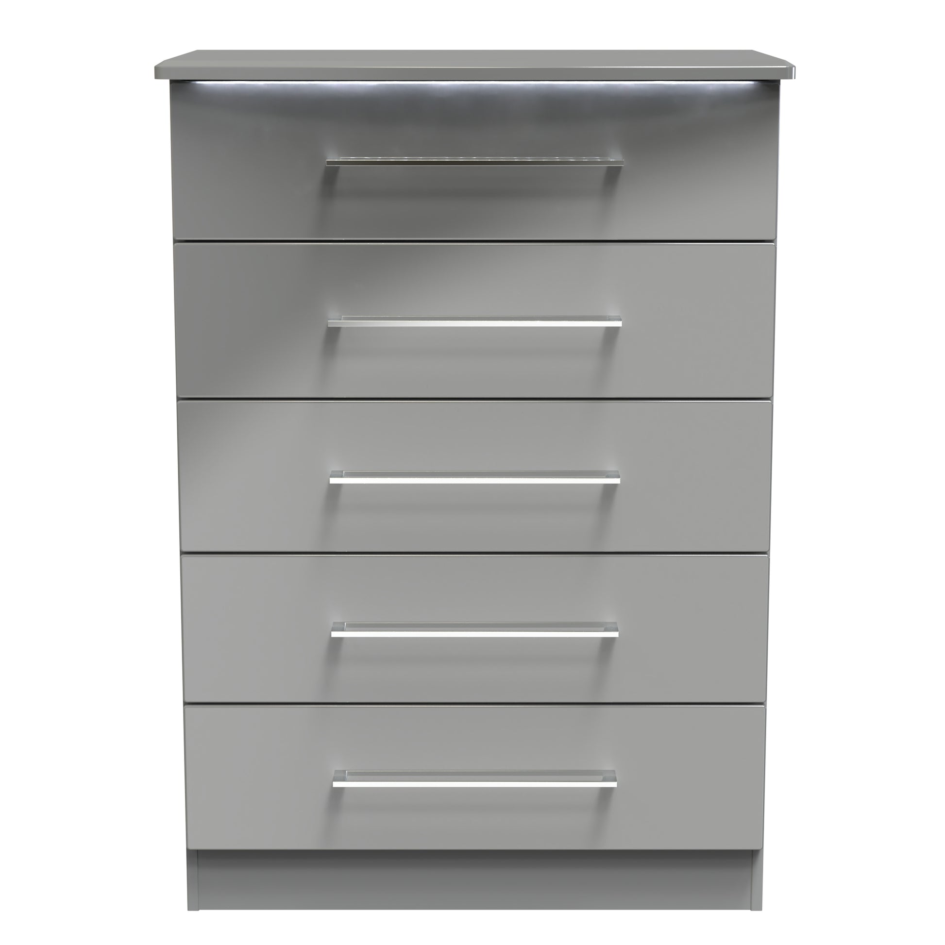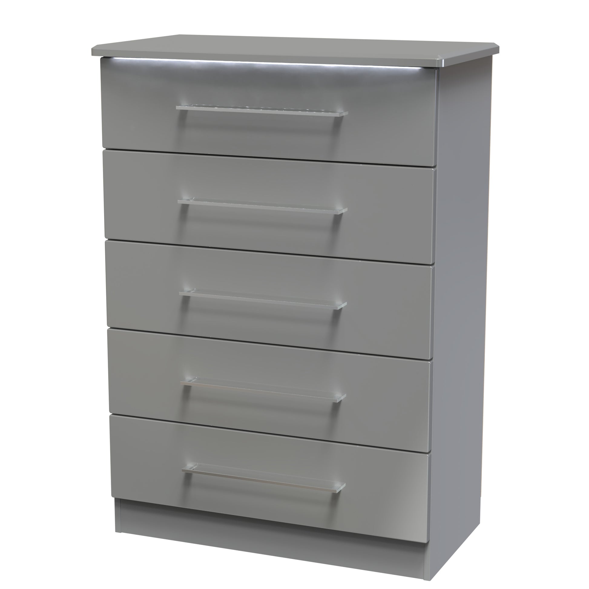 This wide 5 drawer chest of drawers is practical and stylish. Perfect for any home as a free standing storage unit. Light up your bedroom with the shiny style of this stunning range. A dazzling range of ready-assembled bedroom furniture featuring white or grey matt bodies and gloss finish doors/drawer fronts. With built-in lighting which illuminates the contents – making everything much easier to find, even in the dark. All our furniture is made to order in the United Kingdom, to the highest quality. It is delivered within 10 working days direct to your location of choice by one of our two man delivery teams, and comes fully assembled - Please Note that any handles or legs may be removed durning transit to avoid the risk of damage. Part of the Paris Collection.