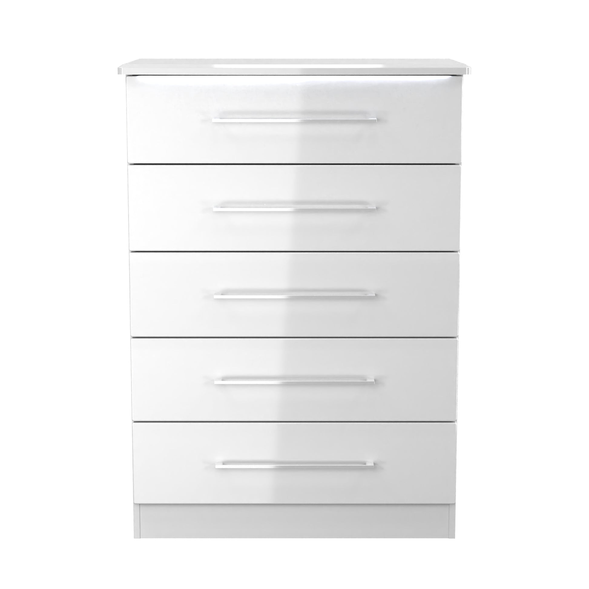 This wide 5 drawer chest of drawers is practical and stylish. Perfect for any home as a free standing storage unit. Light up your bedroom with the shiny style of this stunning range. A dazzling range of ready-assembled bedroom furniture featuring white or grey matt bodies and gloss finish doors/drawer fronts. With built-in lighting which illuminates the contents – making everything much easier to find, even in the dark. All our furniture is made to order in the United Kingdom, to the highest quality. It is delivered within 10 working days direct to your location of choice by one of our two man delivery teams, and comes fully assembled - Please Note that any handles or legs may be removed durning transit to avoid the risk of damage. Part of the Paris Collection.