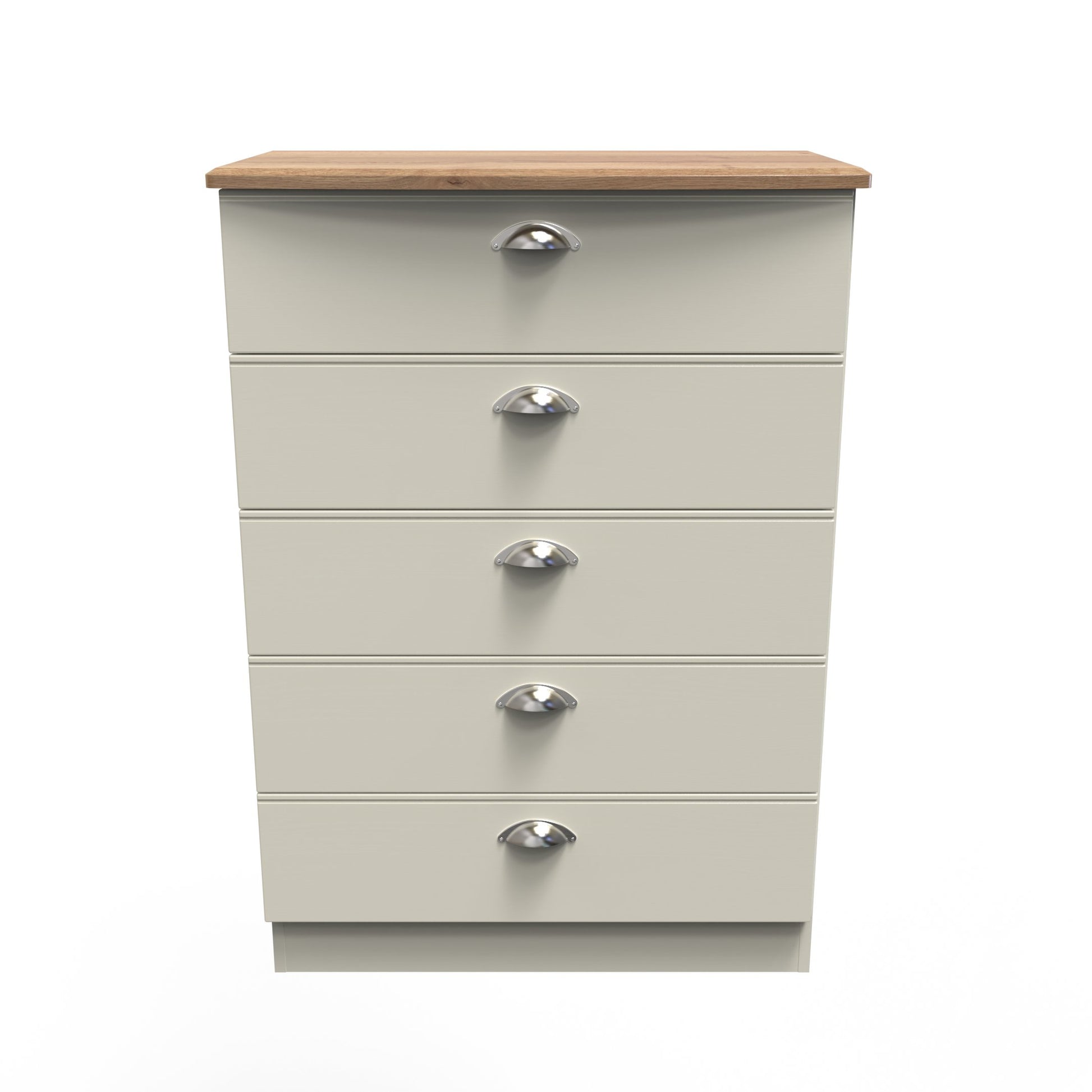 This wide 5 drawer chest of drawers is practical and stylish. Perfect for any home as a free standing storage unit. It's easy to create a bedroom that showcases effortless chic, with this stylish range. The shaker-inspired design exudes understated luxury, each piece is finished in a number of colours with brushed steel handles and the option of a contrasting oak effect top. A well-thought-out mix of hanging and flat storage that's suitable for any room. All our furniture is made to order in the United Kingdom, to the highest quality. It is delivered within 10 working days direct to your location of choice by one of our two man delivery teams, and comes fully assembled (although legs may be removed to prevent damage in transit). Part of the Victoria Collection.