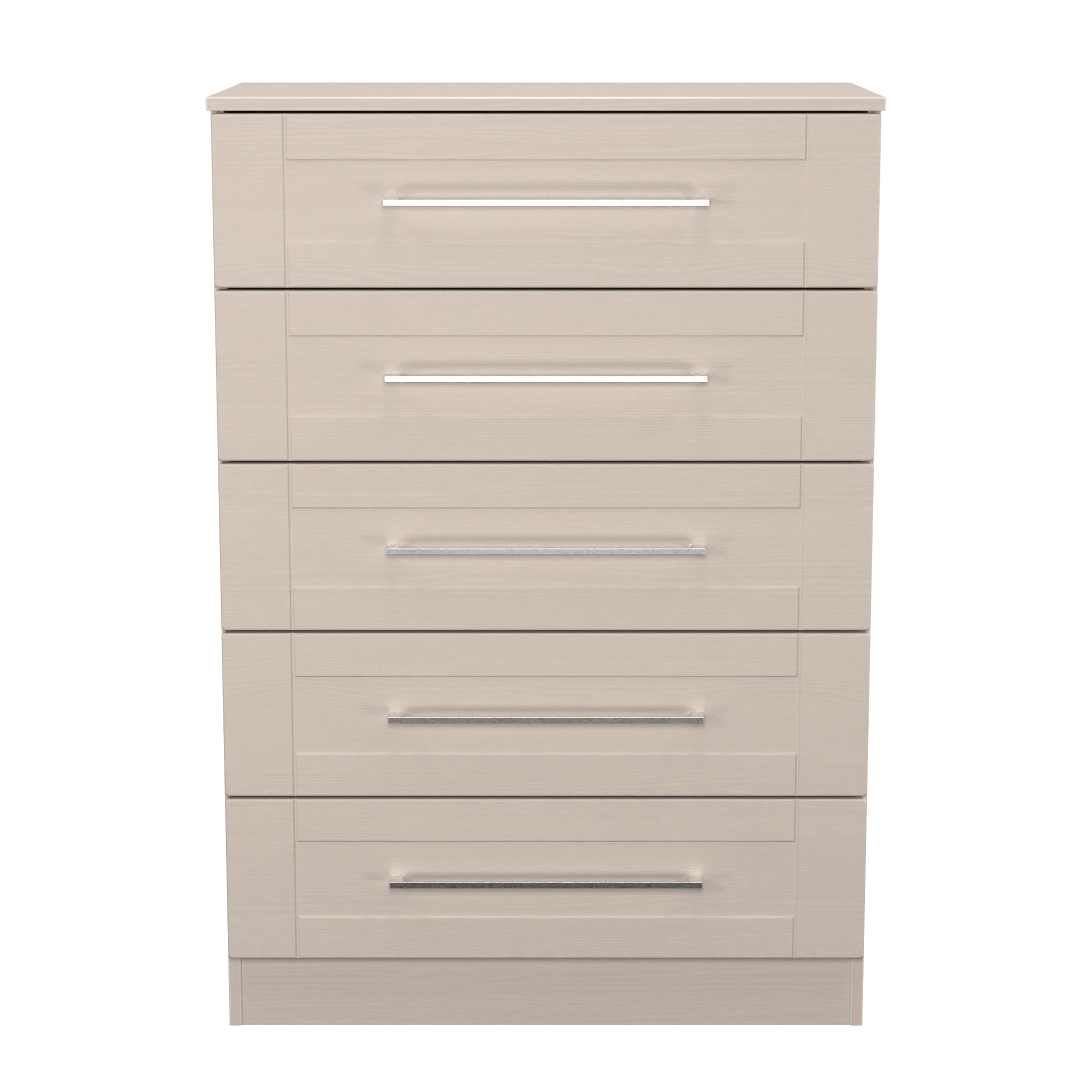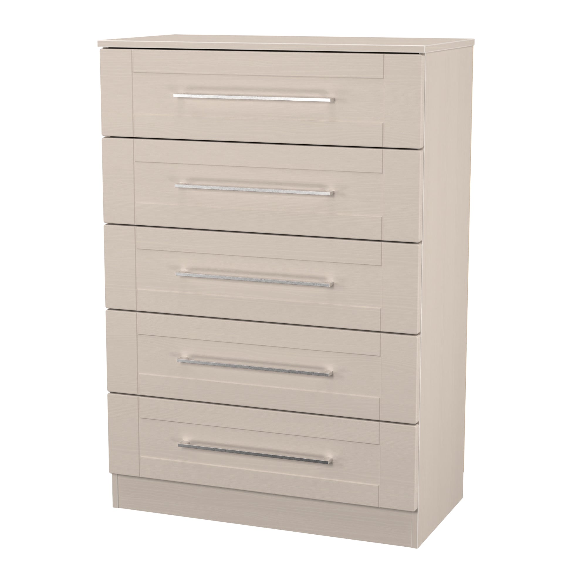This wide 5 drawer chest of drawers is practical and stylish. Perfect for any home as a free standing storage unit. Wood grain effect, panelled design, recessed fronts and chrome handles, this Range is a beautifully elegant collection. With this range you have the freedom to choose from a wide range of furniture configurations, allowing you to create the perfect combination to optimise your storage space. All our furniture is made to order in the United Kingdom, to the highest quality. It is delivered within 10 working days direct to your location of choice by one of our two man delivery teams, and comes fully assembled (although legs may be removed to prevent damage in transit). Part of the York Collection.