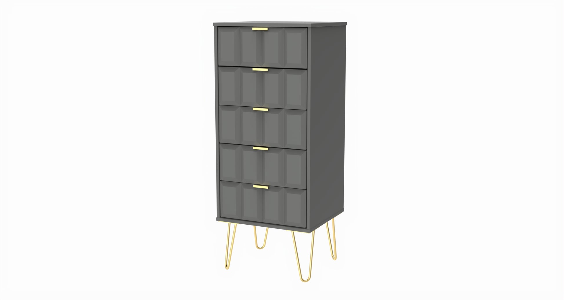This 5 drawer chest of drawers is practical and stylish. Perfect for any home as a free standing storage unit. A modern and distinctive range. This ranges unique aesthetic is best represented by the distinctive "Cube" patten of the drawer and door fronts. Also features Gold Metal Handles and Gold Hairpin Legs. Comes in a wide range of colours including eye cathching two tone colour combinations. All our furniture is made to order in the United Kingdom, to the highest quality. It is delivered within 10 working days direct to your location of choice by one of our two man delivery teams, and comes fully assembled (although legs may be removed to prevent damage in transit). Part of the Cube Collection.
