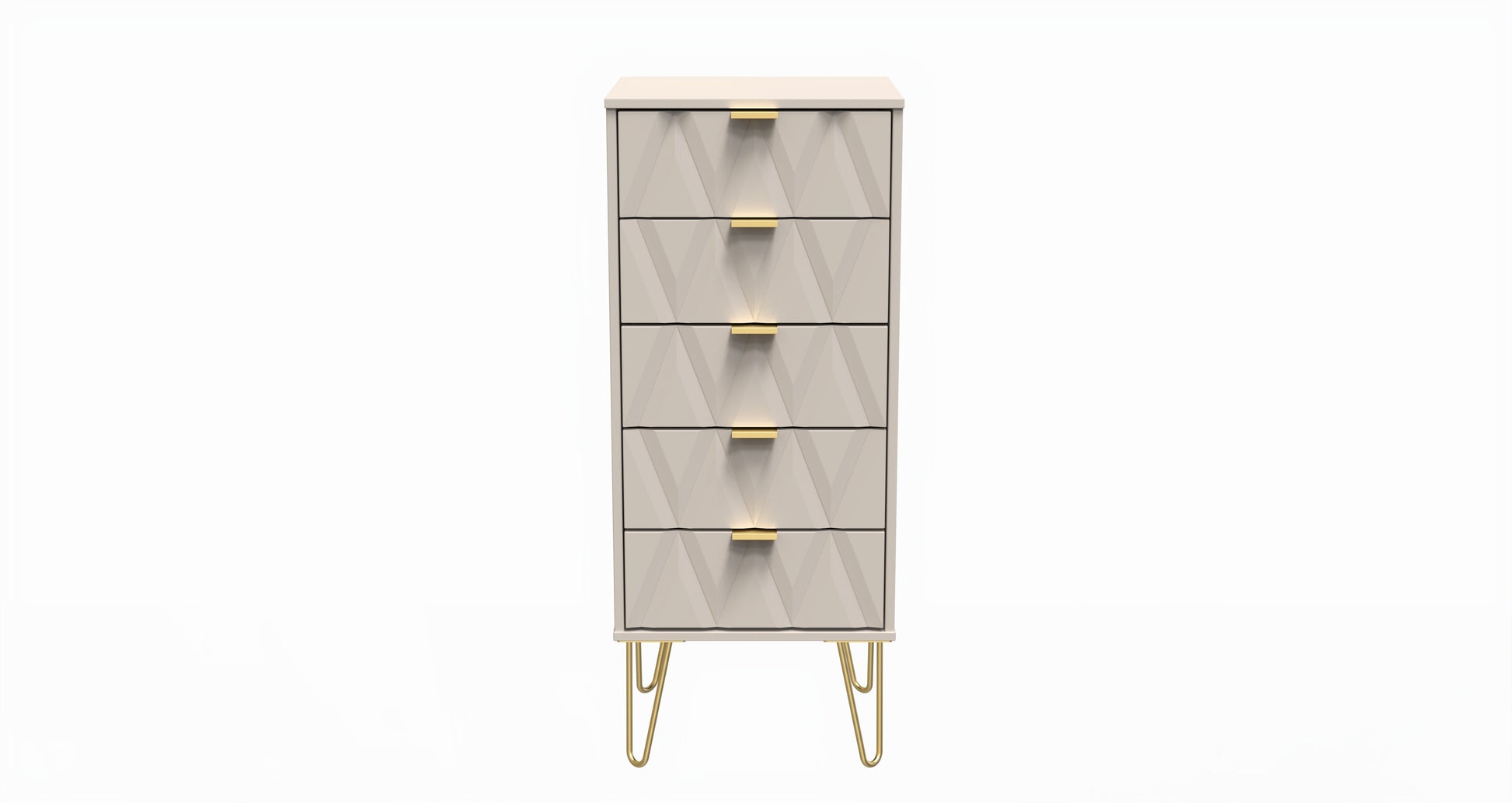 This 5 drawer chest of drawers is practical and stylish. Perfect for any home as a free standing storage unit. Say hello to contemporary cool with this modern range, with distinctive patterned drawers and a variety of colour options available to compliment any interior design. Gold metal handles and sturdy hairpin legs complete the storage solution. All our furniture is made to order in the United Kingdom, to the highest quality. It is delivered within 10 working days direct to your location of choice by one of our two man delivery teams, and comes fully assembled (although legs may be removed to prevent damage in transit). Part of the Diamond Collection.