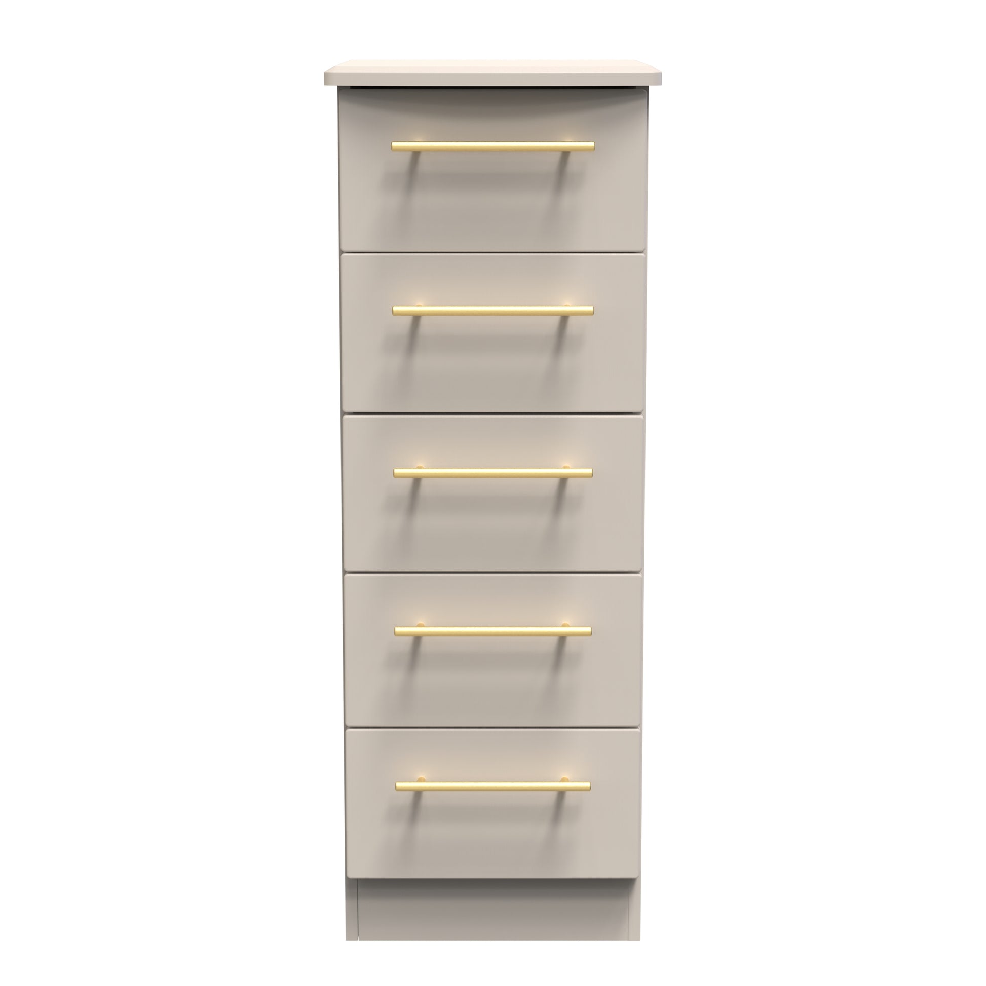 This 5 drawer chest of drawers is practical and stylish. Perfect for any home as a free standing storage unit. This range is modern and elegant with a smooth clean design. Features sleek gold T-Bar handles and comes ina range of scratch resistant colours. All our furniture is made to order in the United Kingdom, to the highest quality. All our furniture is made to order in the United Kingdom, to the highest quality. It is delivered within 10 working days direct to your location of choice by one of our two man delivery teams, and comes fully assembled (although legs may be removed to prevent damage in transit). Part of the Haworth Collection.