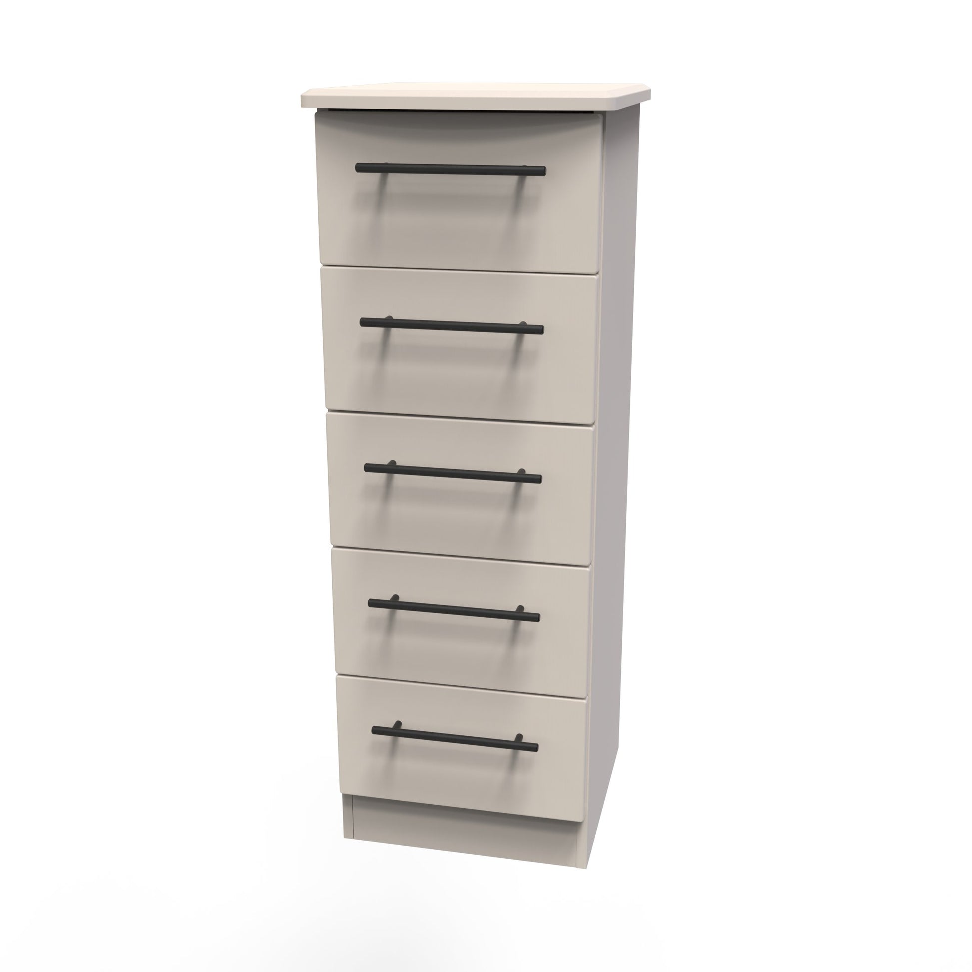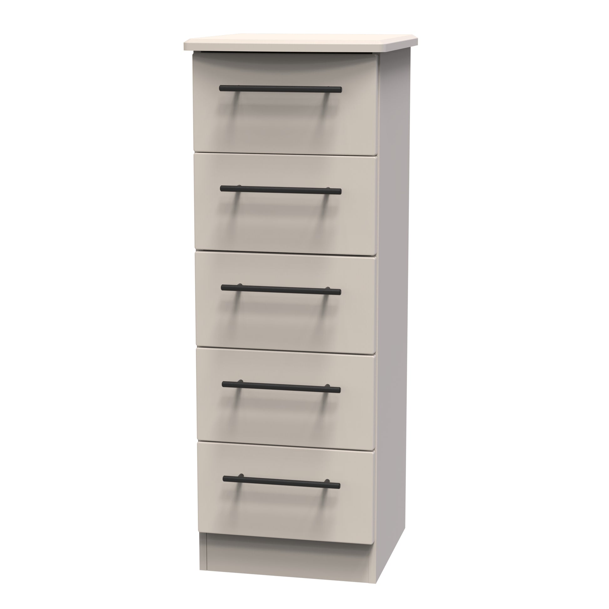 This 5 drawer chest of drawers is practical and stylish. Perfect for any home as a free standing storage unit. This range is modern and elegant with a smooth clean design. Features sleek black T-Bar handles and comes ina range of scratch resistant colours. All our furniture is made to order in the United Kingdom, to the highest quality. It is delivered within 10 working days direct to your location of choice by one of our two man delivery teams, and comes fully assembled (although legs may be removed to prevent damage in transit). Part of the Beverley Collection.