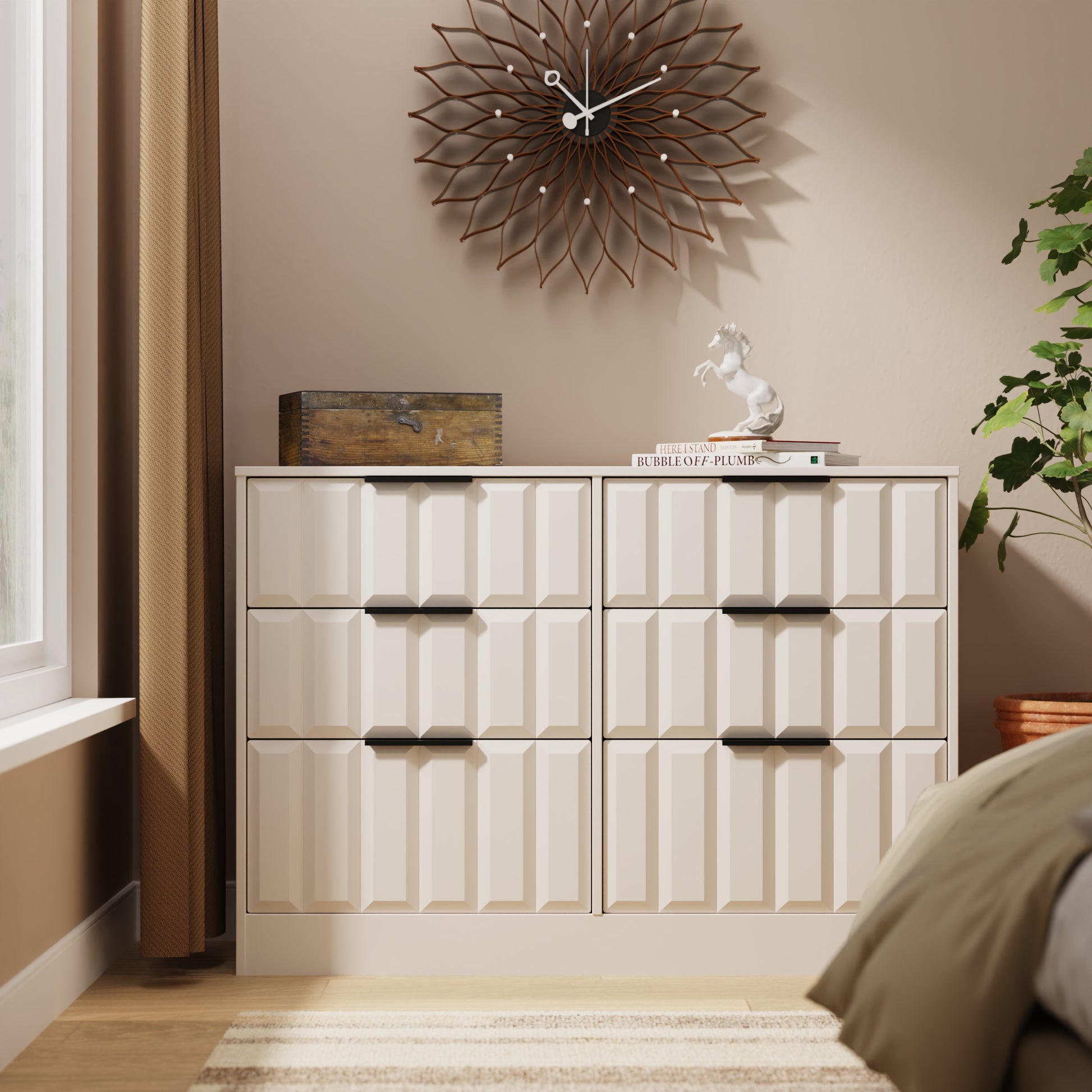 This double width 6 drawer chest of drawers is practical and stylish. Perfect for any home as a free standing storage unit. Elevate your texture palette with an item from this modern and stylish range. Elevating the feel of the room through adding depth to the furniture surface. Use it to compliment or contrast the room, helping to improve the visual interaction. Part of the New York C Collection.
