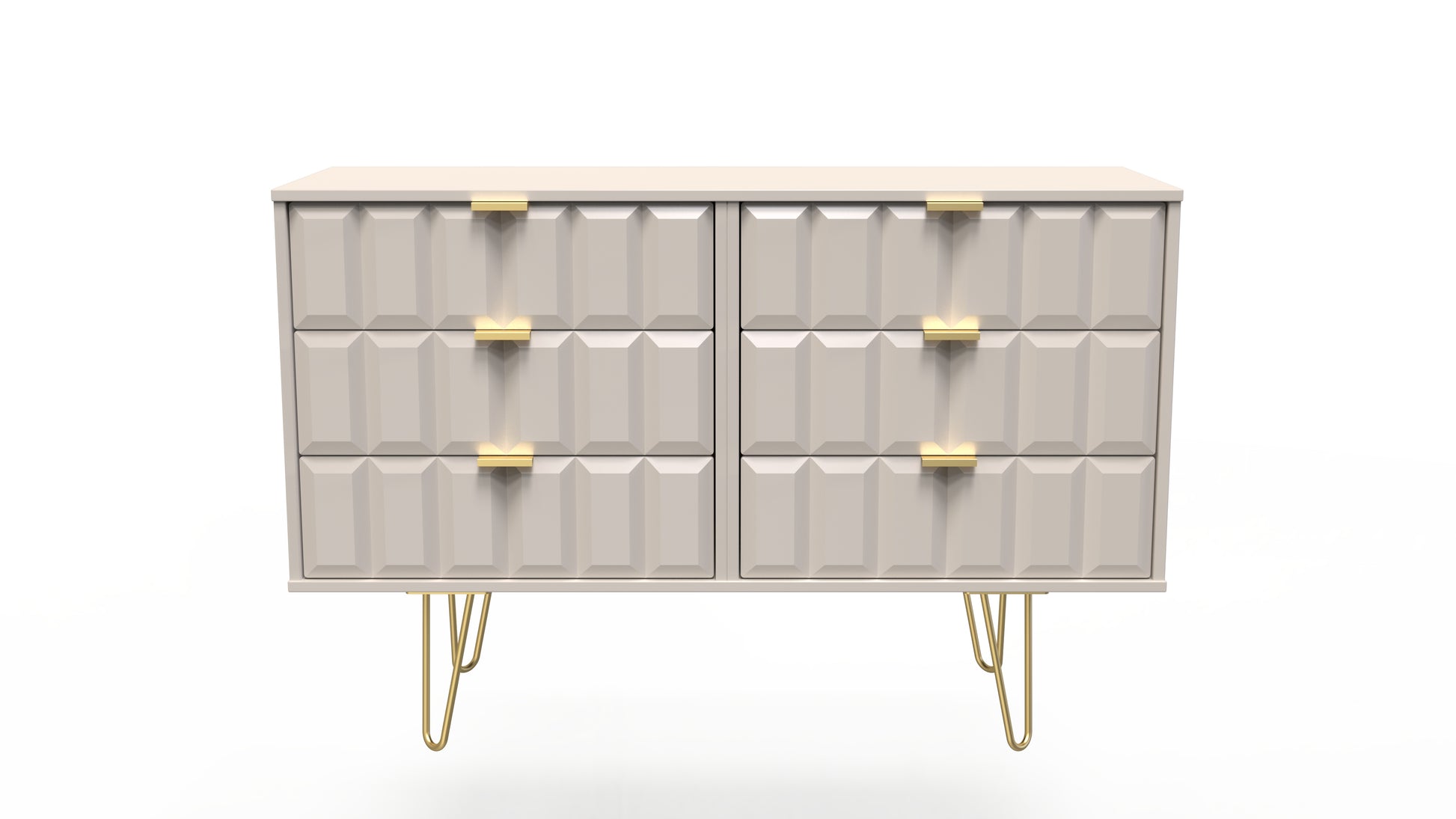 This double width 6 drawer chest of drawers is practical and stylish. Perfect for any home as a free standing storage unit. A modern and distinctive range. This ranges unique aesthetic is best represented by the distinctive "Cube" patten of the drawer and door fronts. Also features Gold Metal Handles and Gold Hairpin Legs. Comes in a wide range of colours including eye cathching two tone colour combinations. All our furniture is made to order in the United Kingdom, to the highest quality. It is delivered within 10 working days direct to your location of choice by one of our two man delivery teams, and comes fully assembled (although legs may be removed to prevent damage in transit). Part of the Cube Collection.