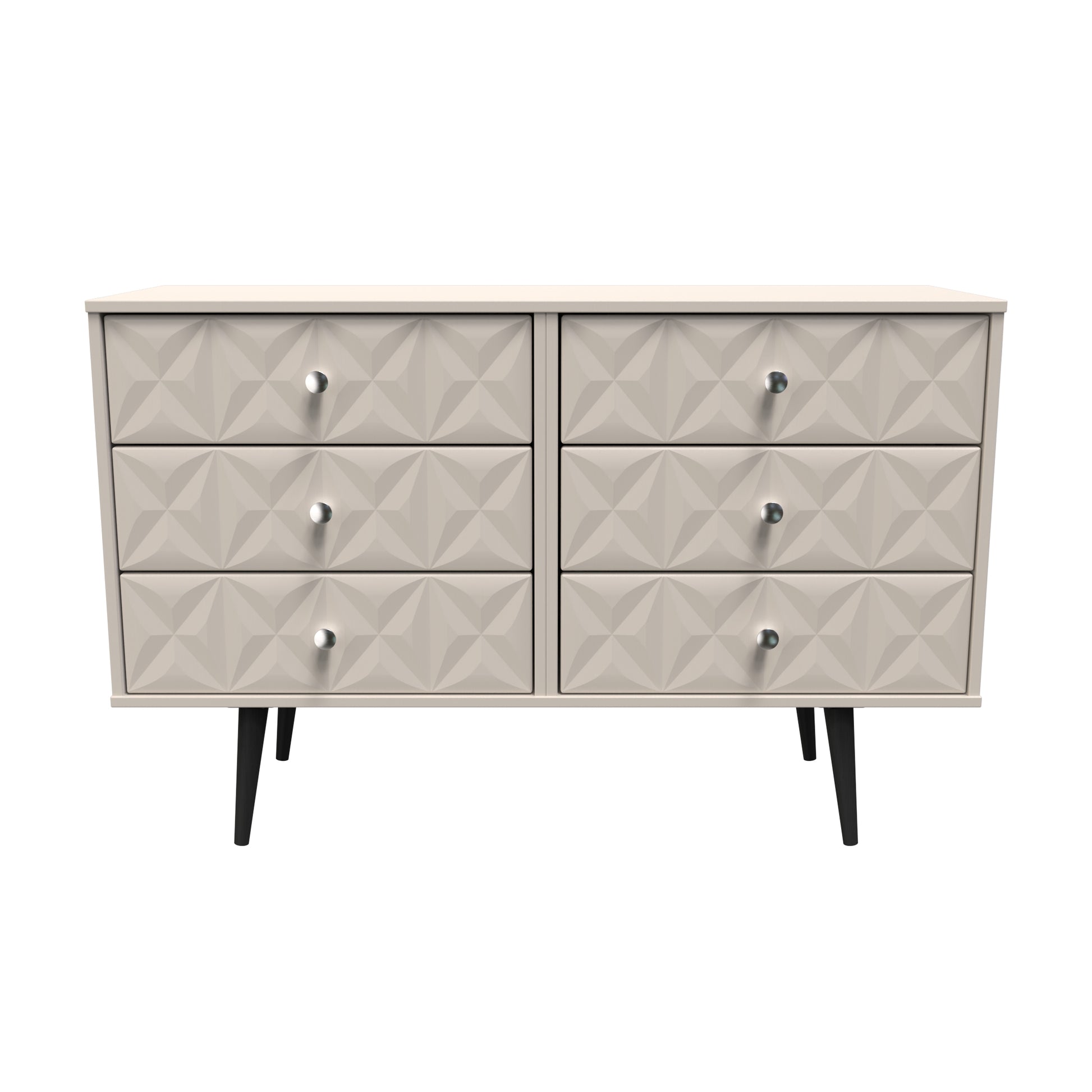 This double width 6 drawer chest of drawers is practical and stylish. Perfect for any home as a free standing storage unit. A modern and distinctive range. This ranges unique aesthetic is best represented by the distinctive "Pixel" patten of the drawer and door fronts. Also features Black Metal Handles and Black Hairpin Legs. Comes in a wide range of colours including eye cathching two tone colour combinations. All our furniture is made to order in the United Kingdom, to the highest quality. It is delivered within 10 working days direct to your location of choice by one of our two man delivery teams, and comes fully assembled (although legs may be removed to prevent damage in transit). Part of the Pixel Collection.