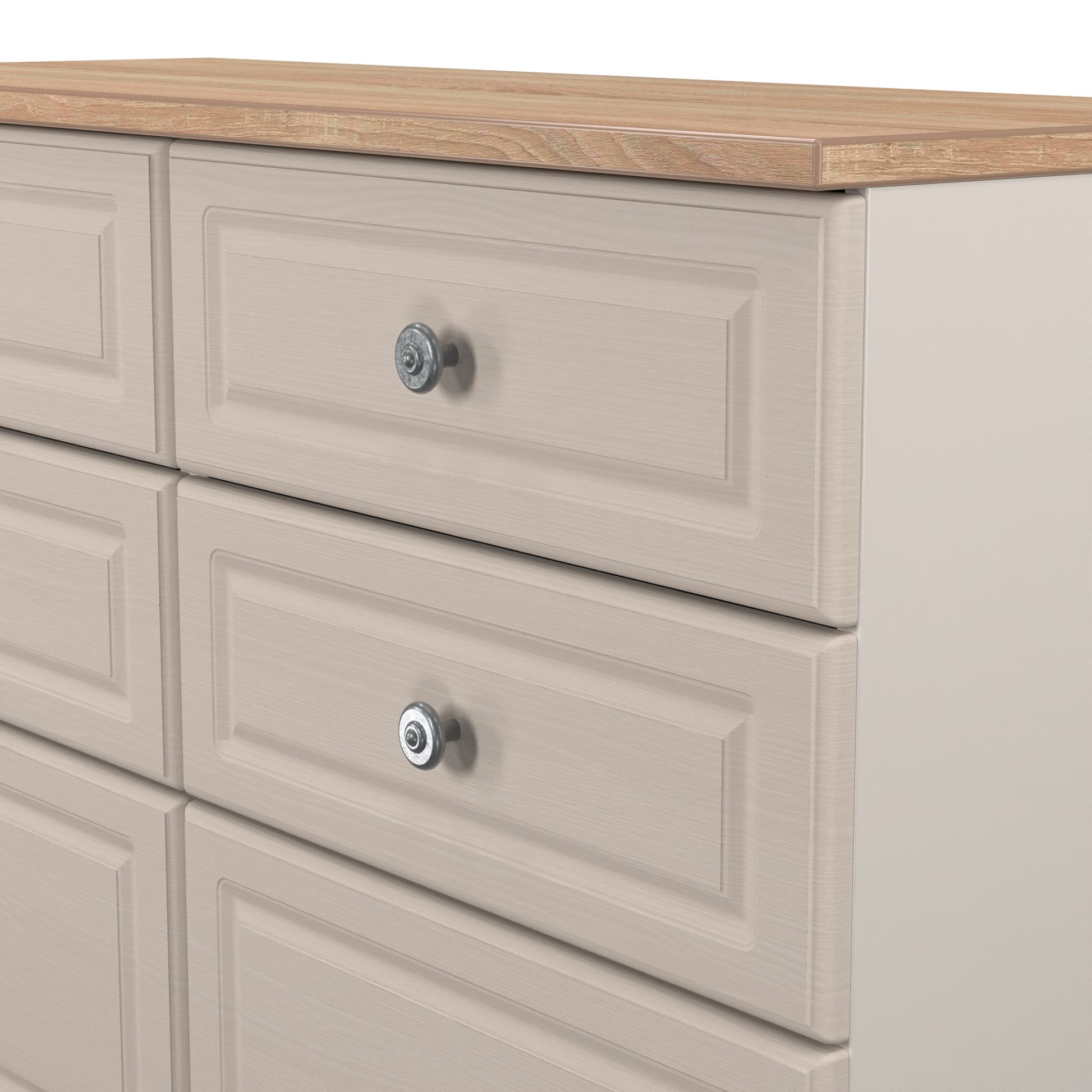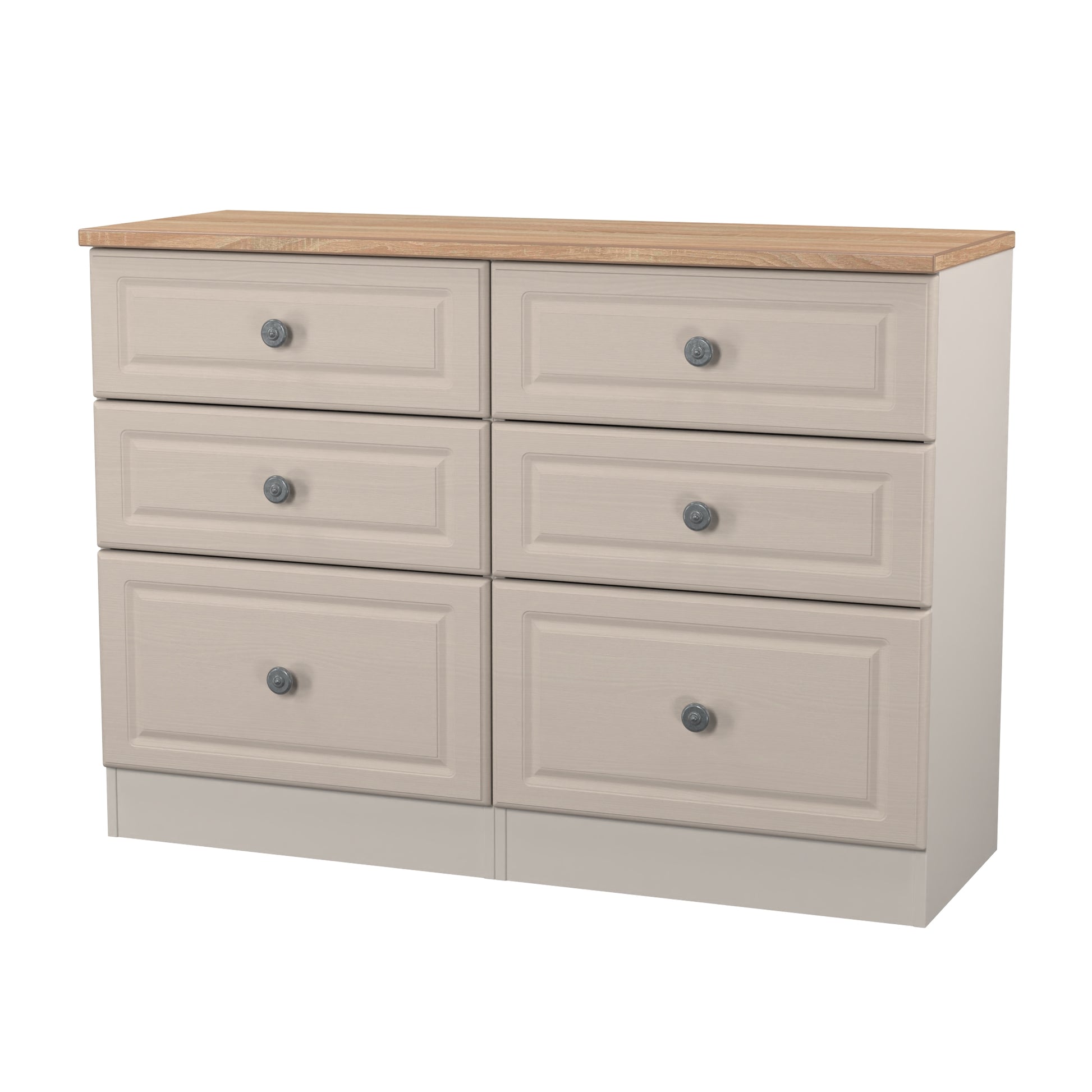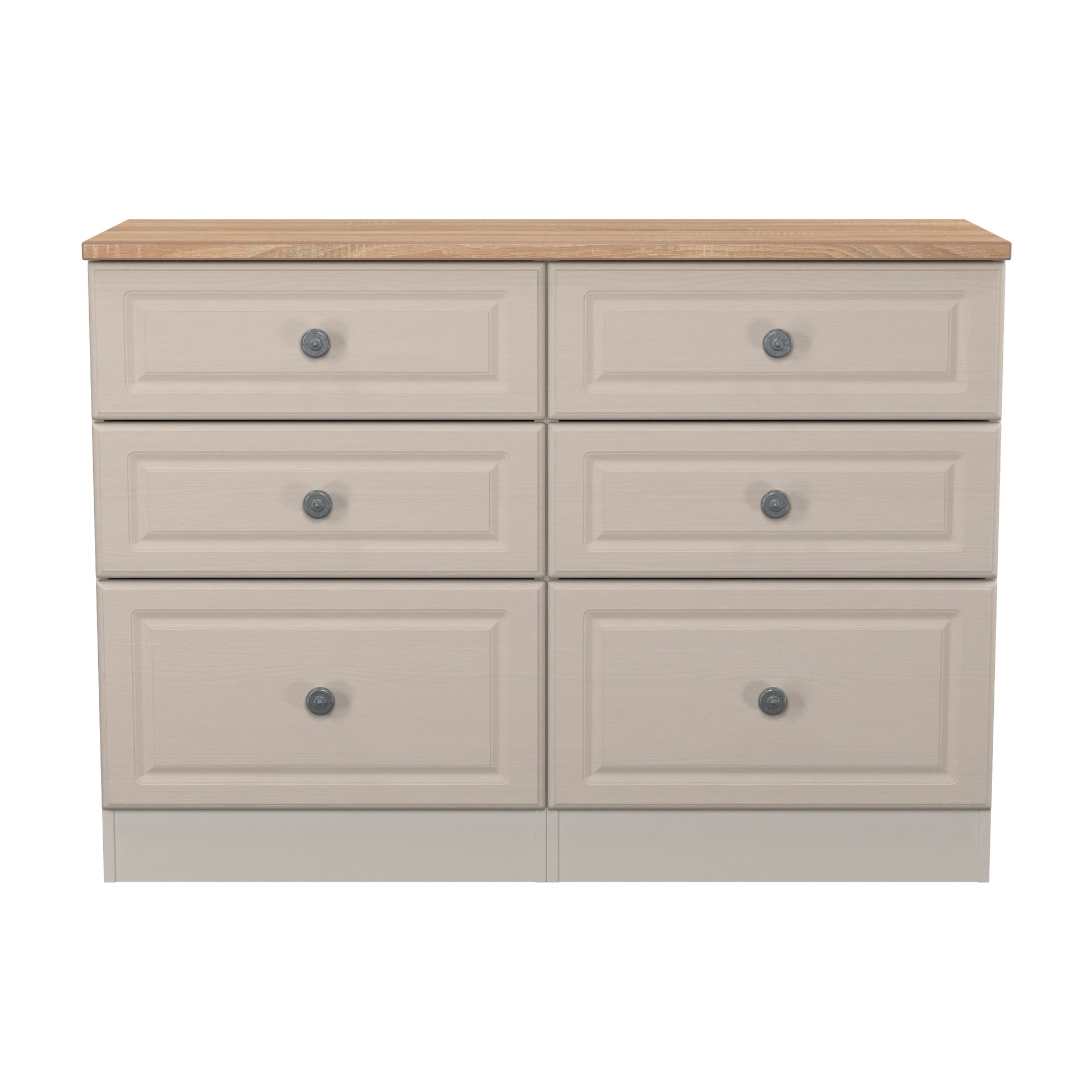 This double width 6 drawer chest of drawers is practical and stylish. Perfect for any home as a free standing storage unit. This classic range uses traditional edge finishes and wood effect tops, to create a range of classic looking furniture pieces. Contrasting finishes create the tonal variations seen here with brushed steel handle mounted on wood grained fronts. All our furniture is made to order in the United Kingdom, to the highest quality. It is delivered within 10 working days direct to your location of choice by one of our two man delivery teams, and comes fully assembled - Please Note that any handles or legs may be removed durning transit to avoid the risk of damage. Part of the Norfolk Collection.