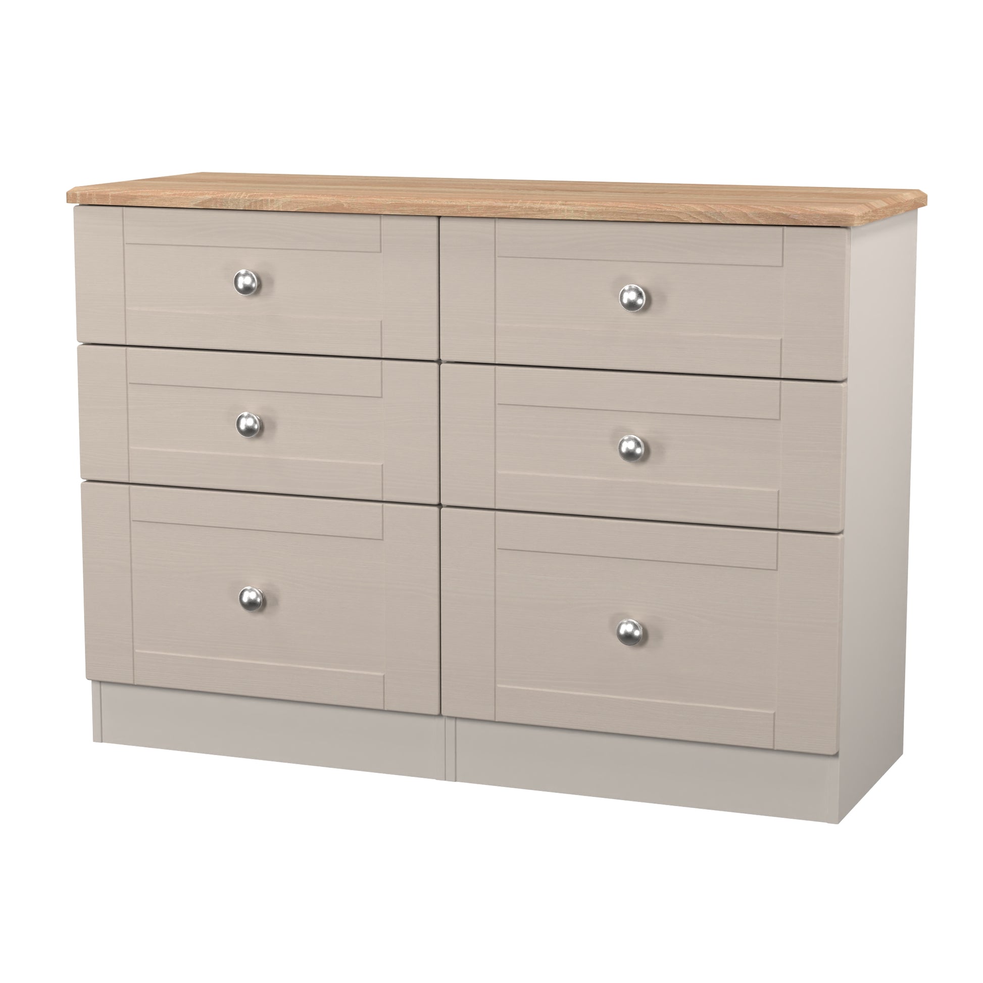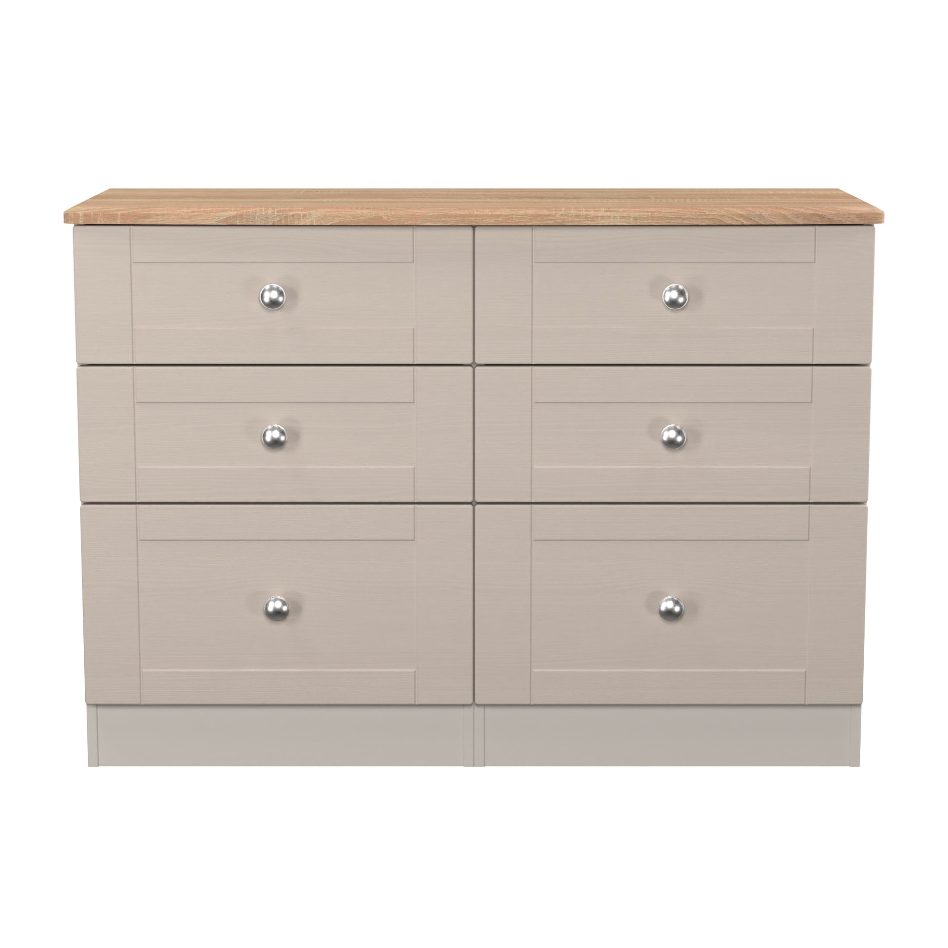 This double width 6 drawer chest of drawers is practical and stylish. Perfect for any home as a free standing storage unit. Wood grain effect, panelled design, recessed fronts, contrasting wood top and chrome handles, this traditional Range is a beautifully elegant collection. With this range you have the freedom to choose from a wide range of furniture configurations, allowing you to create the perfect combination to optimise your storage space. All our furniture is made to order in the United Kingdom, to the highest quality. It is delivered within 10 working days direct to your location of choice by one of our two man delivery teams, and comes fully assembled - Please Note that any handles or legs may be removed durning transit to avoid the risk of damage. Part of the Sussex Collection.