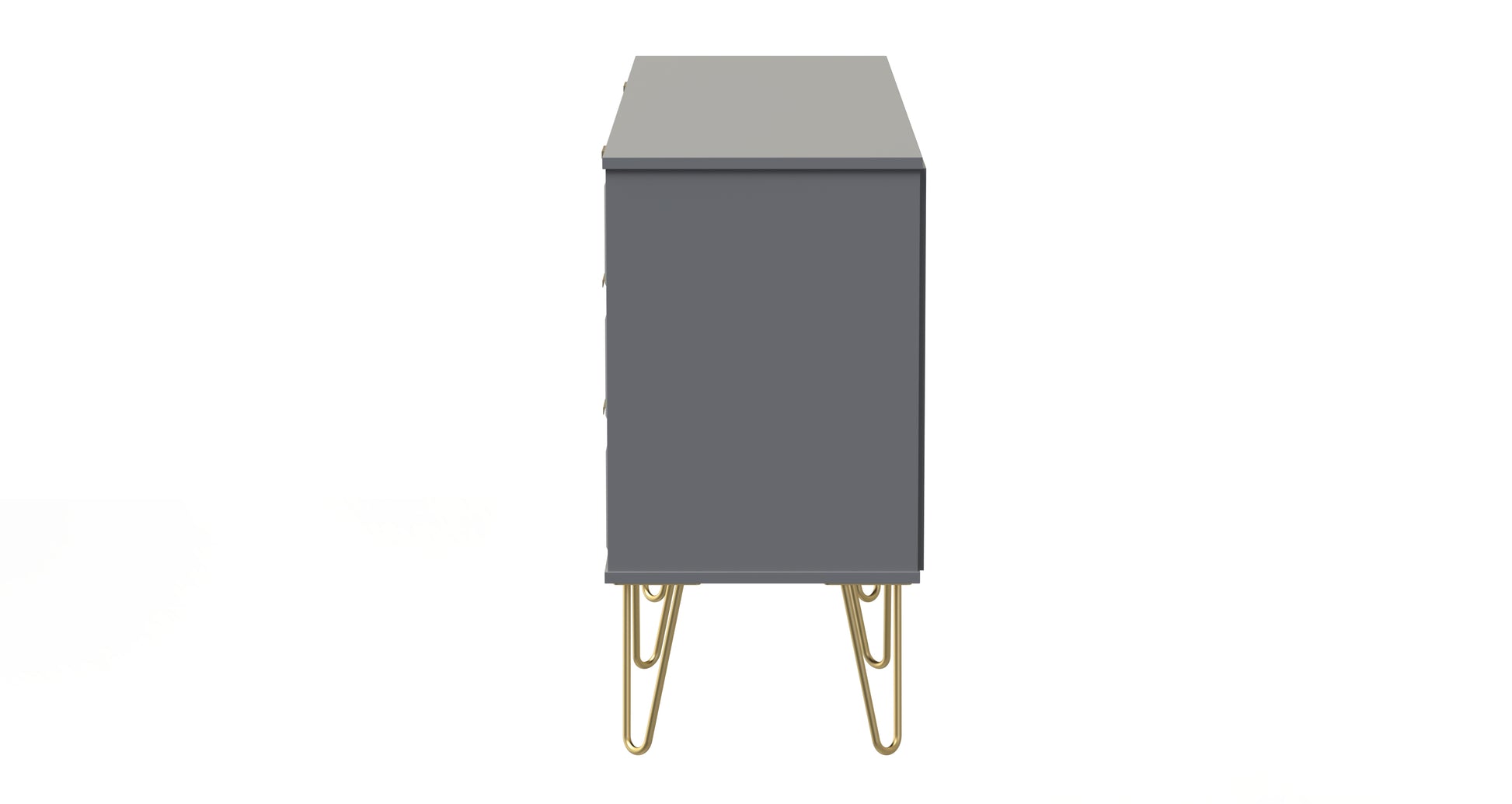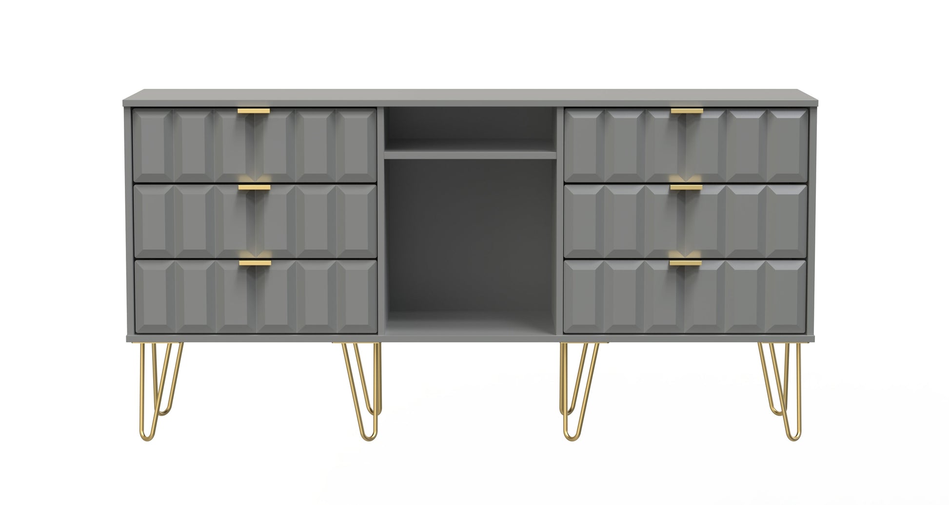 This wide storage unit features 6 storage drawers with a central shelf. Suitable for use as a TV/Media unit or sideboard. A modern and distinctive range. This ranges unique aesthetic is best represented by the distinctive "Cube" patten of the drawer and door fronts. Also features Gold Metal Handles and Gold Hairpin Legs. Comes in a wide range of colours including eye cathching two tone colour combinations. All our furniture is made to order in the United Kingdom, to the highest quality. It is delivered within 10 working days direct to your location of choice by one of our two man delivery teams, and comes fully assembled (although legs may be removed to prevent damage in transit). Part of the Cube Collection.