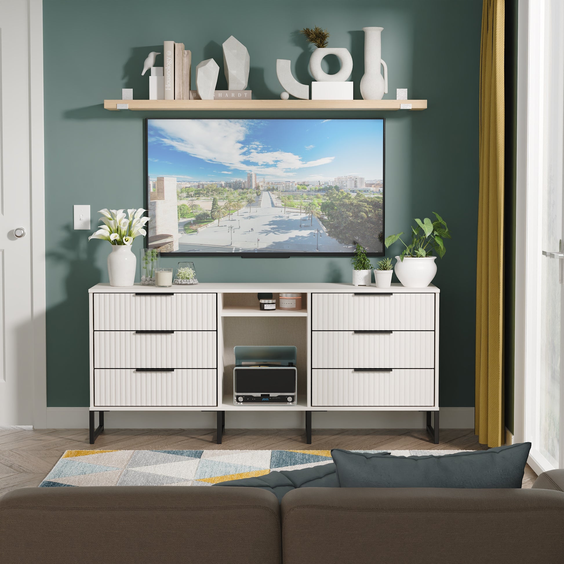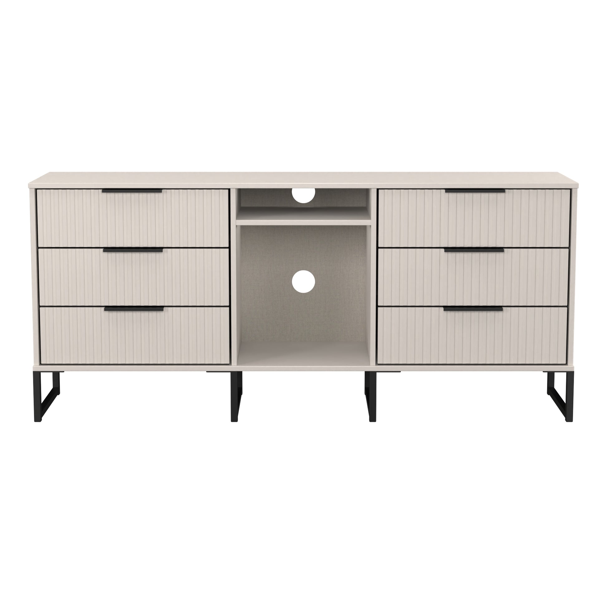 This wide storage unit features 6 storage drawers with a central shelf. Suitable for use as a TV/Media unit or sideboard. A new stand out range, with its new deep cut "fluted" grove patten of the drawer and door fronts. Featuring black metal handles and black sleigh legs. A striking and individual range that is perfect for the modern home. All our furniture is made to order in the United Kingdom, to the highest quality using responsibly sourced materials. It is delivered within 10 working days direct to your location of choice by one of our two man delivery teams, and comes fully assembled (although items with legs will have those legs removed during transit to avoid damage). Part of the Fluted Collection.