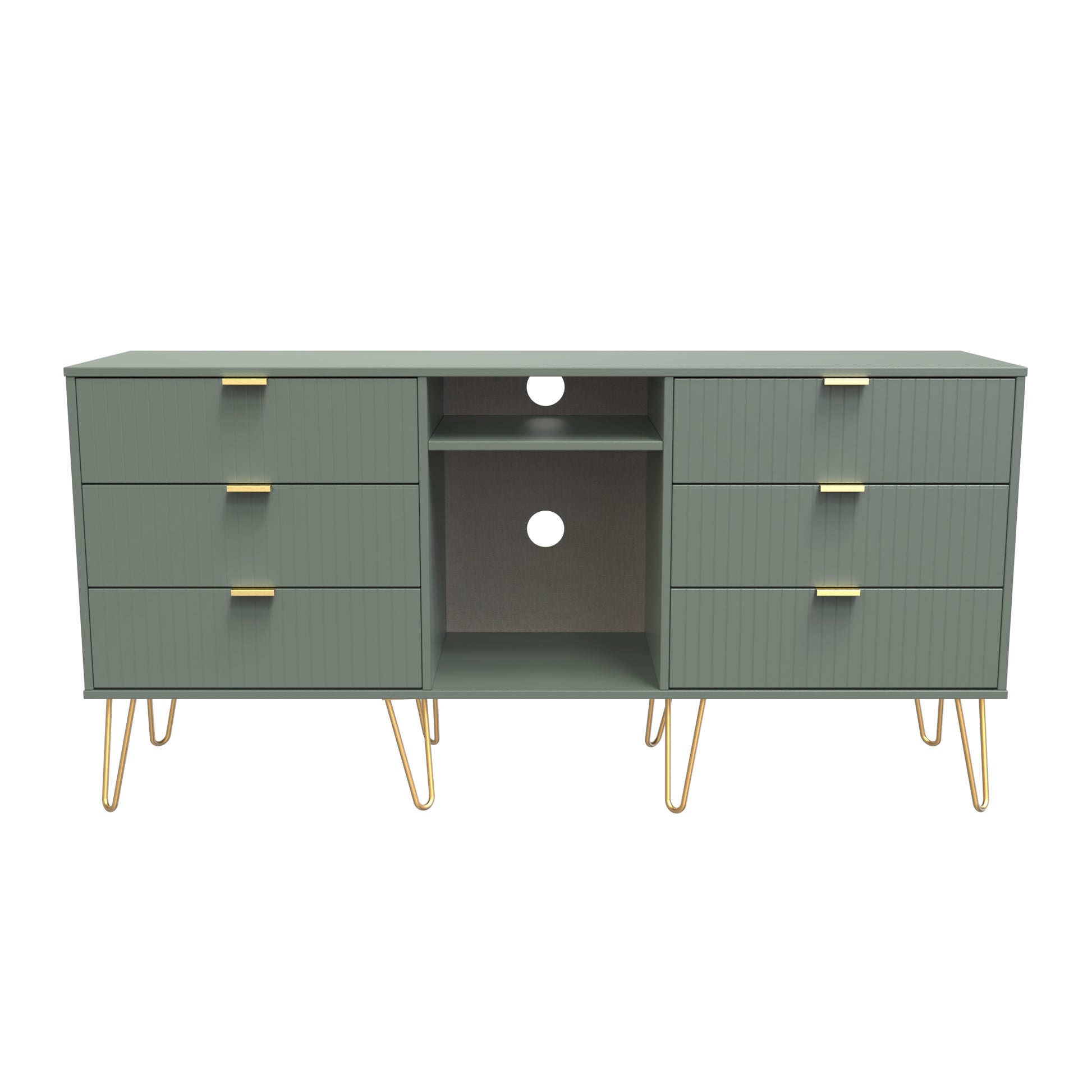This wide storage unit features 6 storage drawers with a central shelf. Suitable for use as a TV/Media unit or sideboard. A modern and distinctive range. This ranges unique aesthetic is best represented by the distinctive "Linear" patten of the drawer and door fronts. Also features Gold Metal Handles and Gold Hairpin Legs. Comes in a wide range of colours including eye cathching two tone colour combinations. All our furniture is made to order in the United Kingdom, to the highest quality. It is delivered within 10 working days direct to your location of choice by one of our two man delivery teams, and comes fully assembled (although legs may be removed to prevent damage in transit). Part of the Linear Collection.