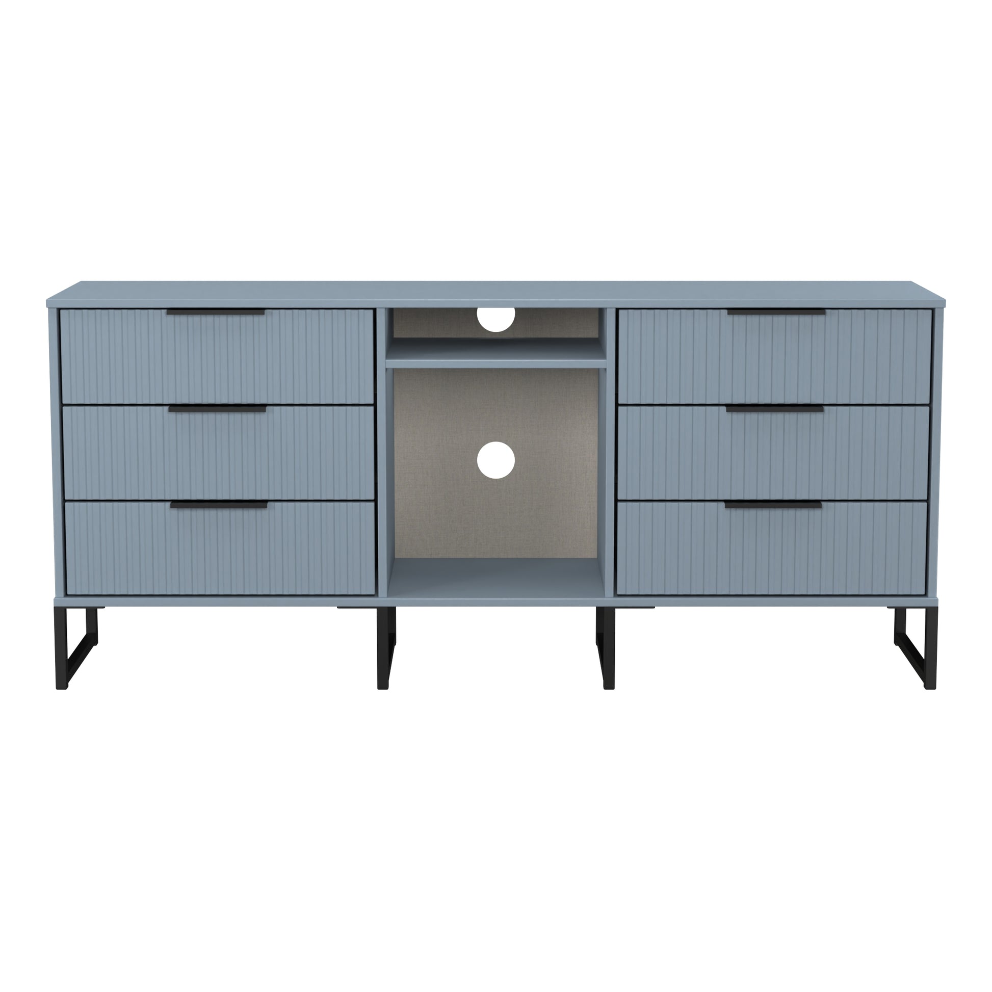 This wide storage unit features 6 storage drawers with a central shelf. Suitable for use as a TV/Media unit or sideboard. A new stand out range, with its new deep cut "fluted" grove patten of the drawer and door fronts. Featuring black metal handles and black sleigh legs. A striking and individual range that is perfect for the modern home. All our furniture is made to order in the United Kingdom, to the highest quality using responsibly sourced materials. It is delivered within 10 working days direct to your location of choice by one of our two man delivery teams, and comes fully assembled (although items with legs will have those legs removed during transit to avoid damage). Part of the Fluted Collection.