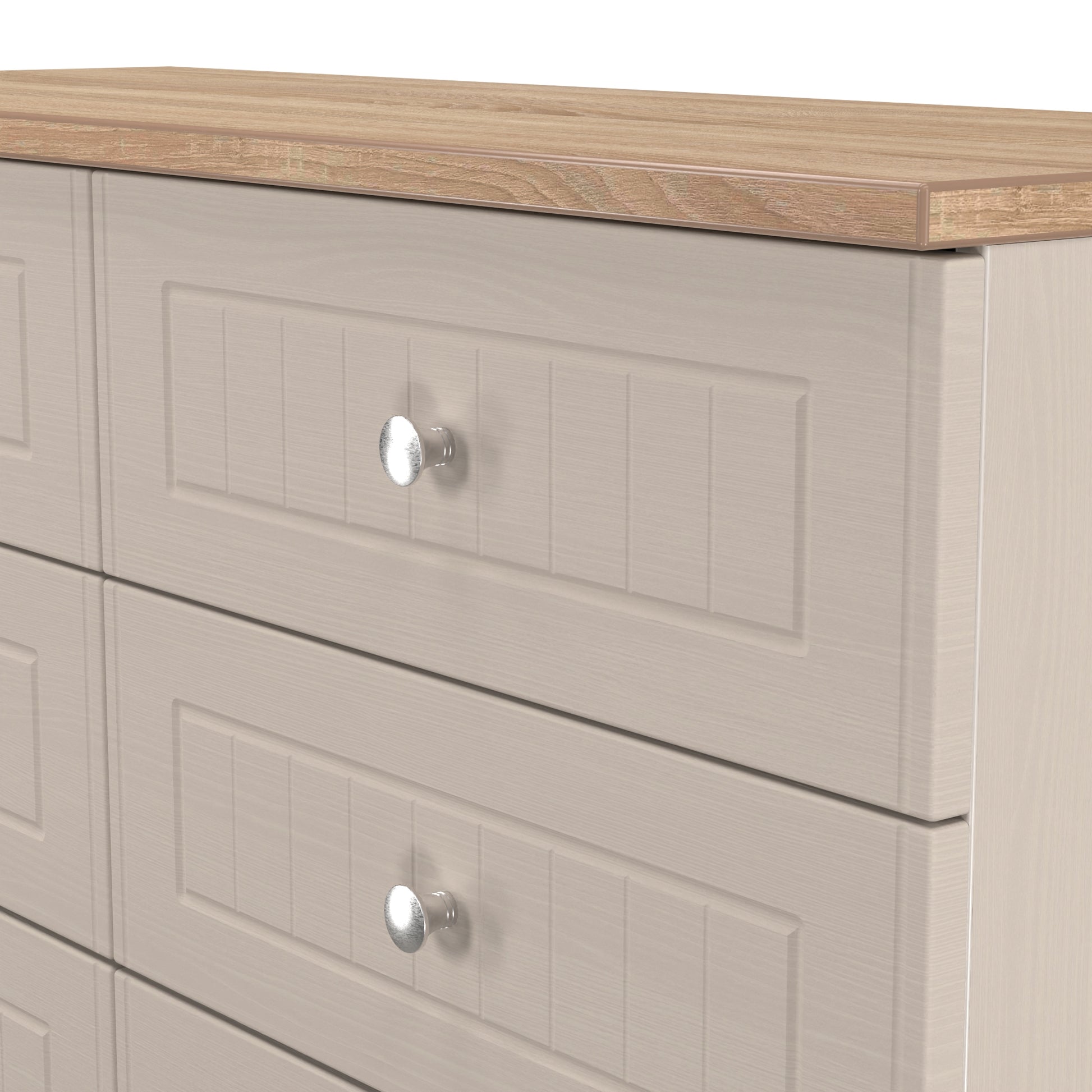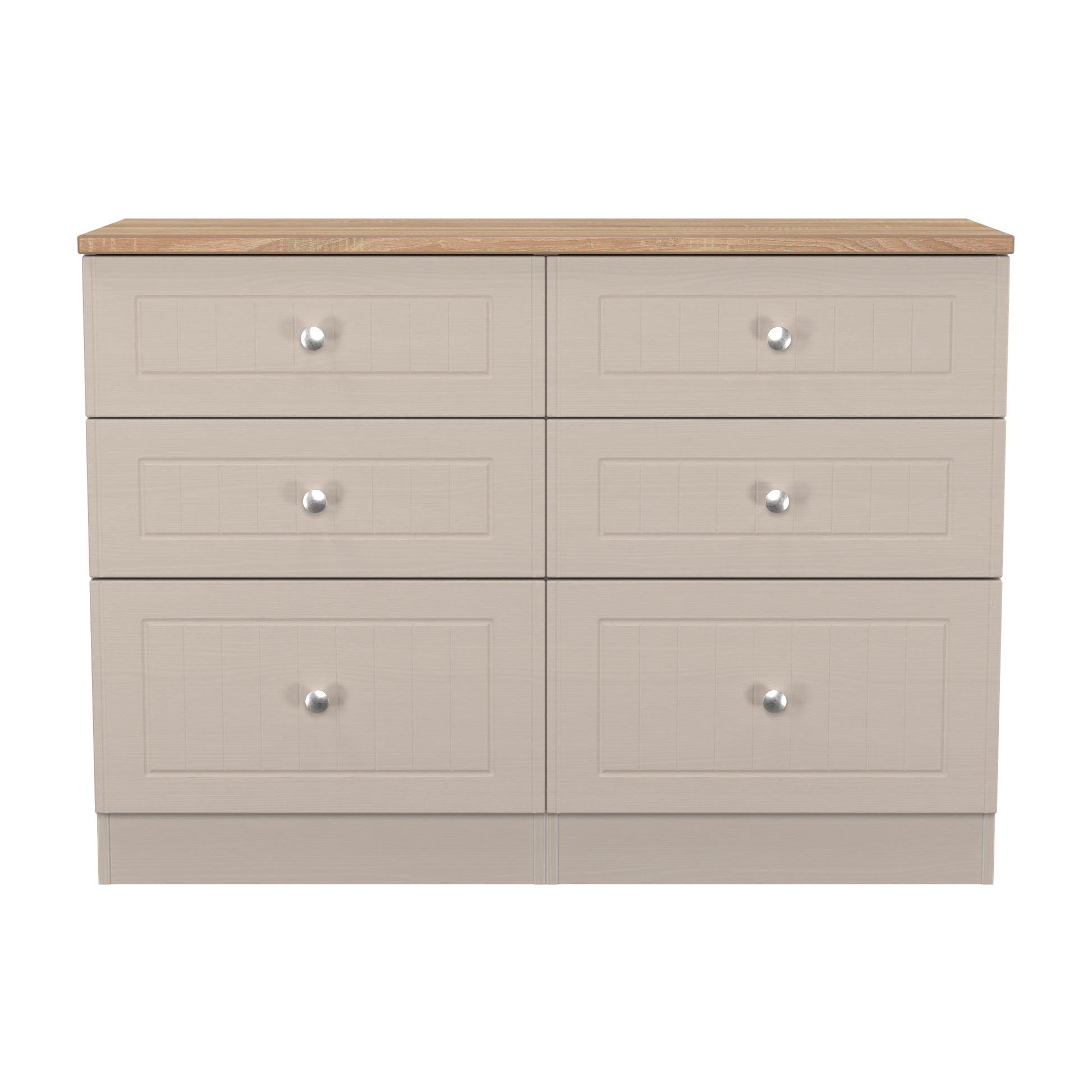 This double width 6 drawer chest of drawers is practical and stylish. Perfect for any home as a free standing storage unit. This classic, elegant range is available in a variety of painted wood finishes with natural wood effect tops and stylish chrome handles on all doors and drawers. This range boasts a classic and traditional design which will compliment a variety of traditional home dà ©cors. All our furniture is made to order in the United Kingdom, to the highest quality. It is delivered within 10 working days direct to your location of choice by one of our two man delivery teams, and comes fully assembled (although legs may be removed to prevent damage in transit). Part of the Vienna Collection.