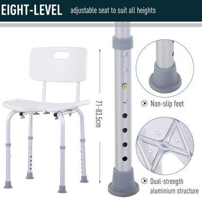 Made for assistance in the shower or bath, this chair from HOMCOM is perfect for the elderly or those who require extra assistance whilst showering or bathing. Made from aluminium, the four legs are resilient to water damage, keeping the chair stable and durable and supporting up to 136kg in weight. Adjustable to eight different heights, this chair helps you find the most comfortable and safe position to sit, with the 'U' shaped plastic seat giving a solid surface to sit. Drainage holes all over the seat prevent water build-up. It's finished with handles to carry easily and non-slip foot pads to keep safely in position.