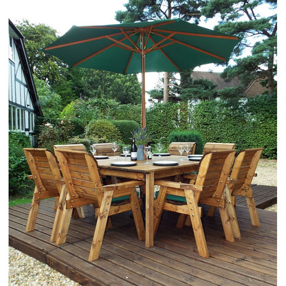 Enjoy drinks, snacks and meals with family and friends with this patio dining set. Practical and comfortable with a spacious, sturdy table and well-designed chairs. This versatile outdoor furniture set can transform and improve any patio or garden area. Wood, with the right care and attention, solid wooden garden furniture can last a lifetime. It doesn’t rust like metal and neither will it lose its colour in the sun like some plastic garden furniture. You and 7 others will be able to relax, enjoy snacks, and chat in the sunshine.