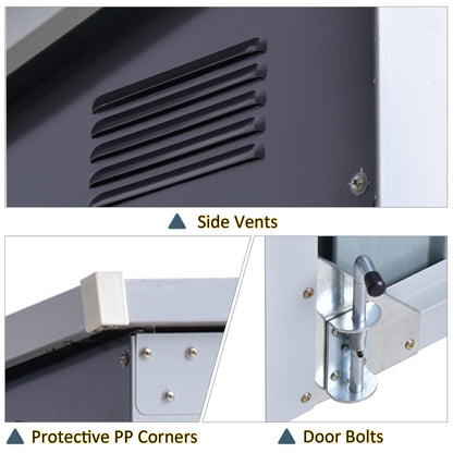 Keep the unsightly mess and smell of rubbish bins out of sight with this specialised storage shed from Outsunny. The frame is made from corrugated steel so it is tough and durable to provide long lasting use, with a weather-resistant coating for protection against mild rusting and wear. Its generous design is able to fit two standard-sized household wheelie bins - perfect for keeping both your normal waste and recycling bins stored. It features two front doors and a lift-up lid, both of which are fitted with locks to keep it securely shut when you're away, with a handy lid connecting chain so the lids open at the same together. Comes with four keys for the locks. A discreet and practical way to keep your home front looking and smelling fresh.