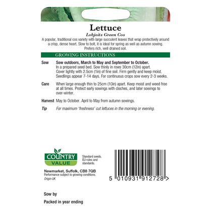 A popular, traditional cos variety with large succulent leaves that wrap protectively around the crisp, dense heart. It is slow to bolt and ideal for spring and autumn sowing. Grow your own delicious produce in any sized garden with a selection of Country Value vegetable seeds. Producing your own food is easy and provides a sustainable way to eat well and enjoy healthy eating. Whether you are looking for herbs, runner beans or seed potatoes, we have everything you need to create a vibrant and varied kitchen garden.