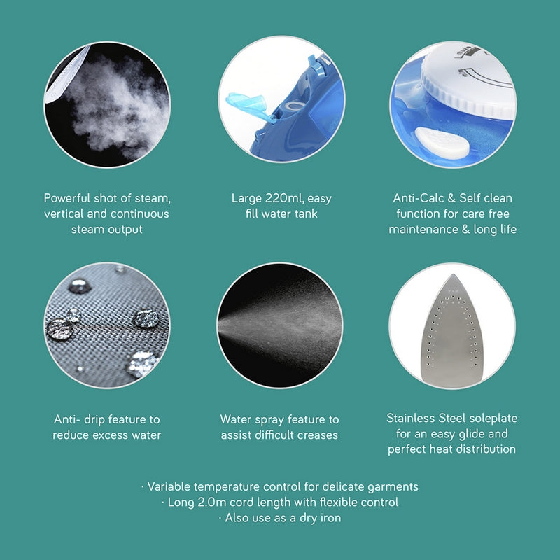 This Crest Steam Iron boasts a range of features to quickly banish creases from clothing, towels and linens. With a stainless steel soleplate for an easy glide and even heat distribution, and options for steam, vertical steam, shot of steam, dry and spray. 1600W power and anti-drip, with an easy-fill water tank. The self-clean and anti-calc functions contribute to lower maintenance and longer life. Attractive translucent blue body.