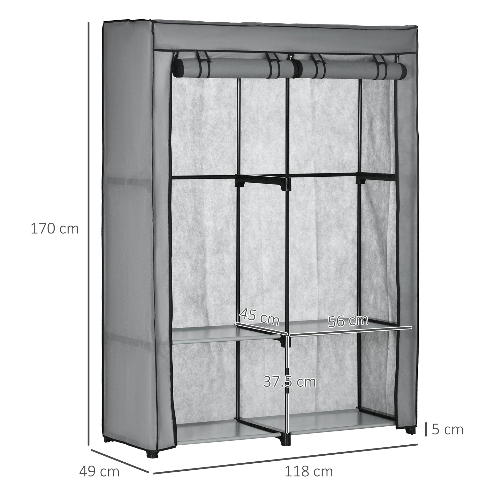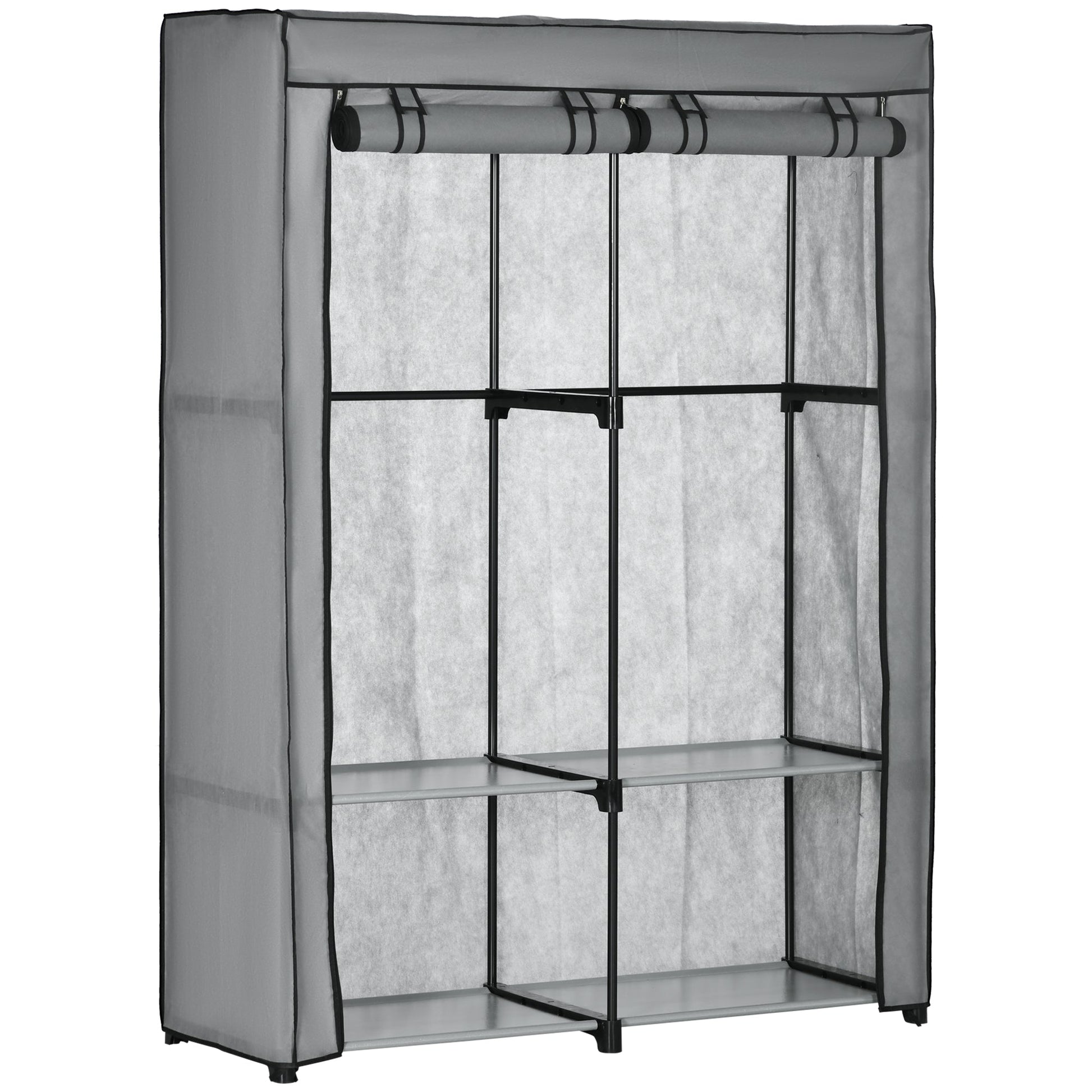 A cloth wardrobe is a great temporary - or even permanent piece for any bedroom and living space. This HOMCOM piece comes with two hanging rails for longer garments, with four shelves to hold plenty of folded pieces. A powder coated steel frame for a strong core, which supports up to 70kg. It comes with a fabric cover to offer protection when needed, with roll-up strip doors to finish.