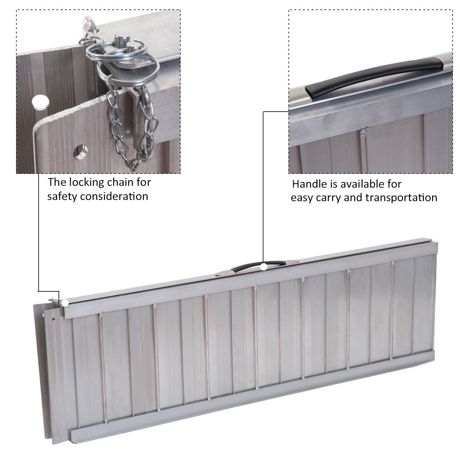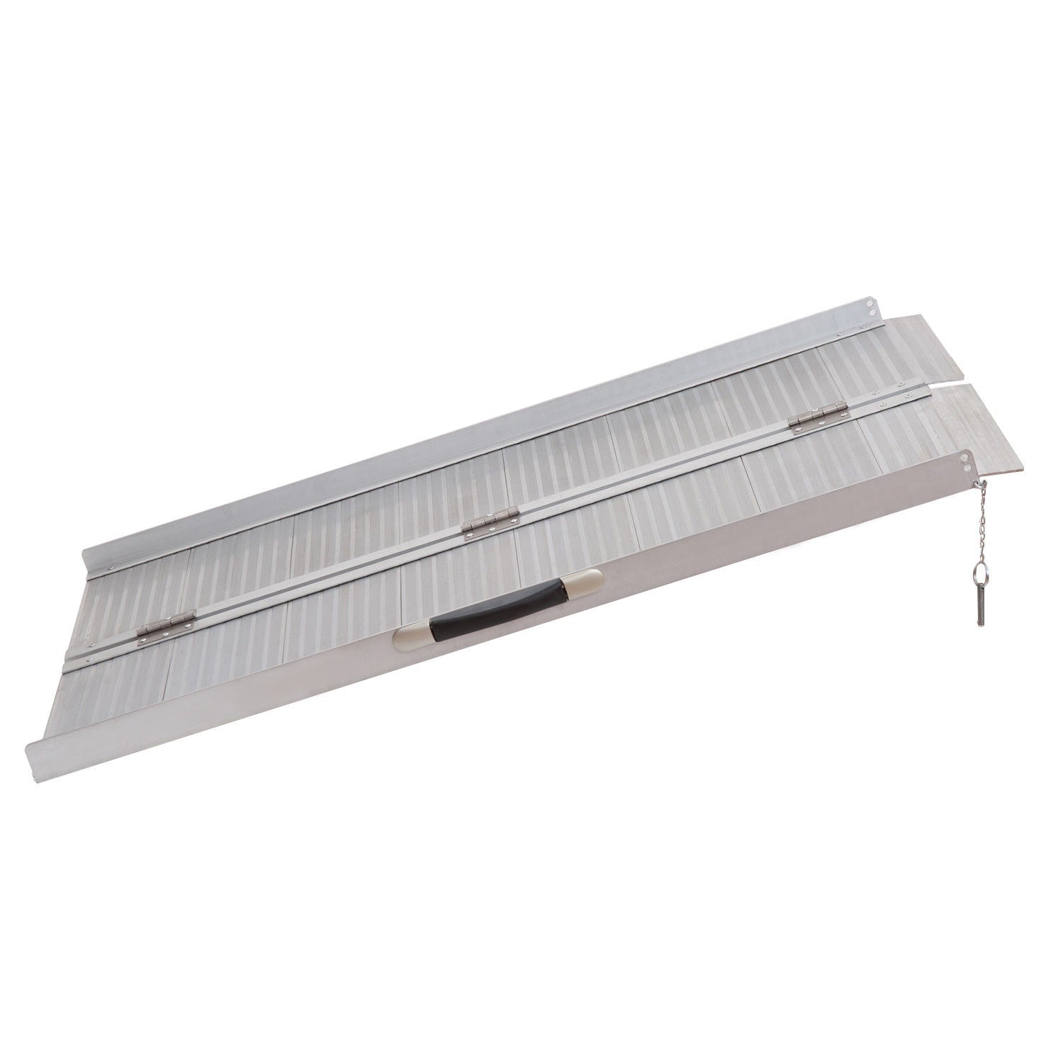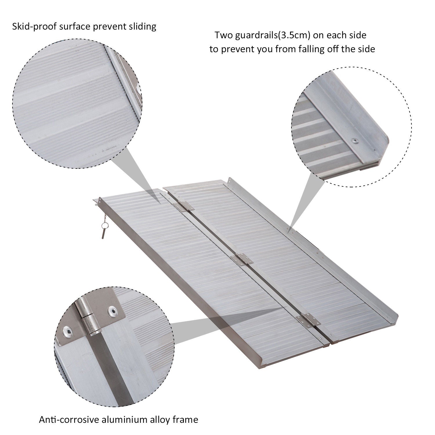 Get easier access to raised surfaces with this ramp from HOMCOM. Covered with skid proof surface to prevent slipping making it ideal for any weather condition. When not in use the ramp can be easily folded, saving space and enabling storage in vehicle or at home. The durable aluminum frame is anti-corrosive to last for years of usage. This ramp can be used with wheelchairs, lawn mowers, scooters or any other heavy item that may have trouble with stairs.