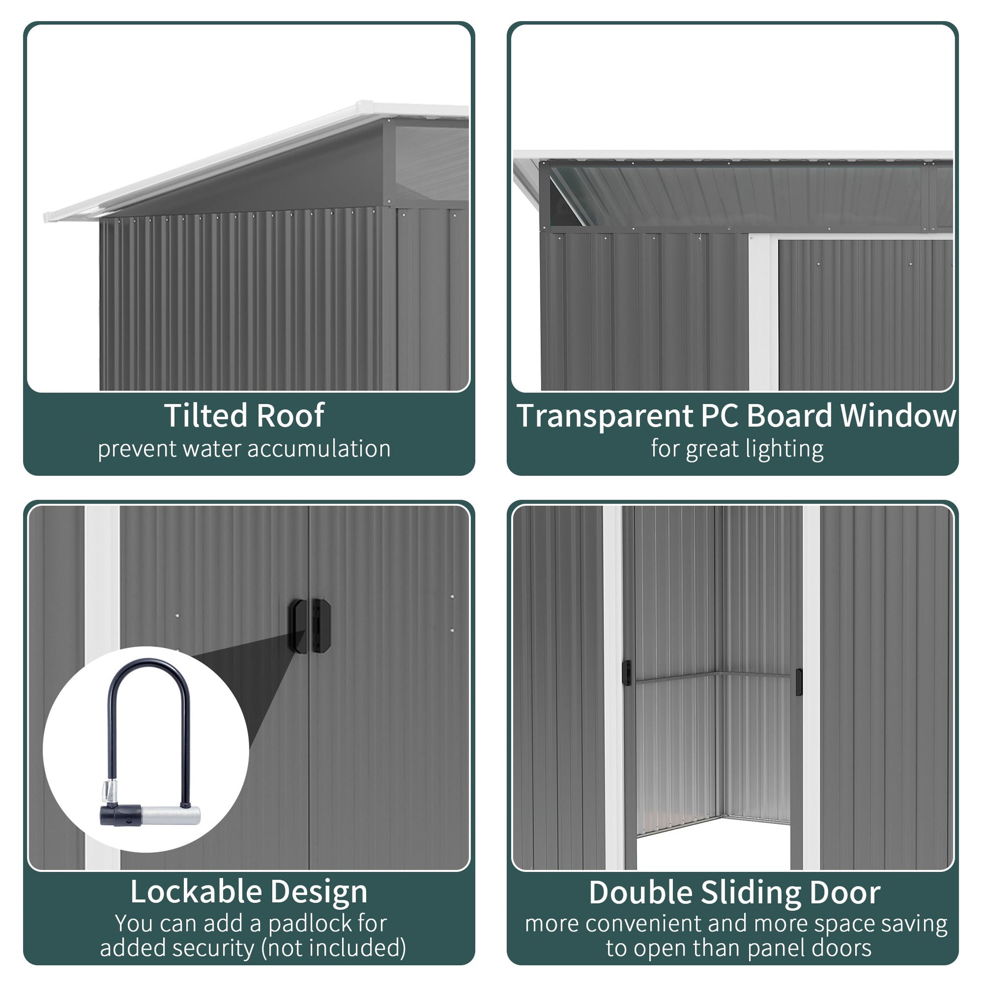 This Outsunny outdoor storage shed is a safe and protective way for keeping tools, equipment and outerwear stored. This corner garden shed is also spacious enough as a bike storage shed for the outdoor adventurers. Made of galvanised steel, the outdoor shed is strong, fitted with a sloped roof to prevent rainwater building up. Two clear front panels allow sunlight to drench through, you can see inside easily during the day. Complete with two lockable sliding doors to enter and leave with ease.