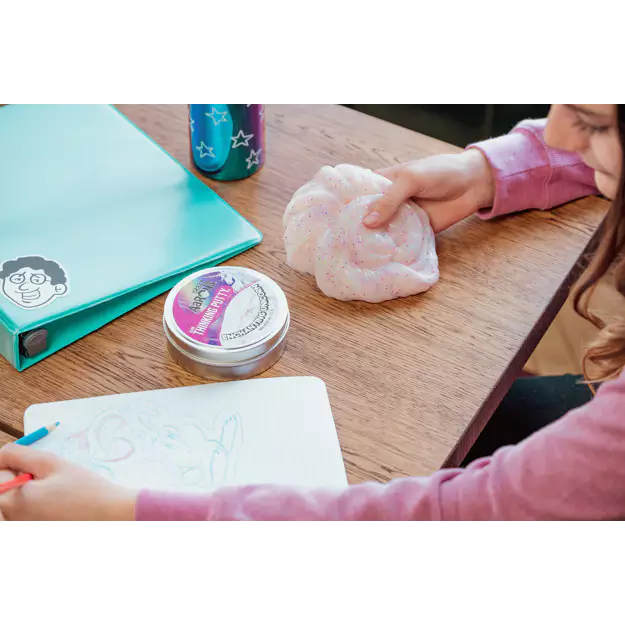 Collection: GLOWBRIGHTS | Color: White with Rainbow Neon Confetti and Gold Glitter | Glows Pink | Texture: Soft | Made in the USA from nontoxic silicone and never dries out | Stretch it, bounce it, pop it, tear it, and sculpt it! Fun for ages 3+ | Includes 1/5 lb. (3.2 oz) of Genuine Crazy Aarons Thinking Putty | Thinking Putty is manufactured with the help of exceptional individuals challenged with disabilities