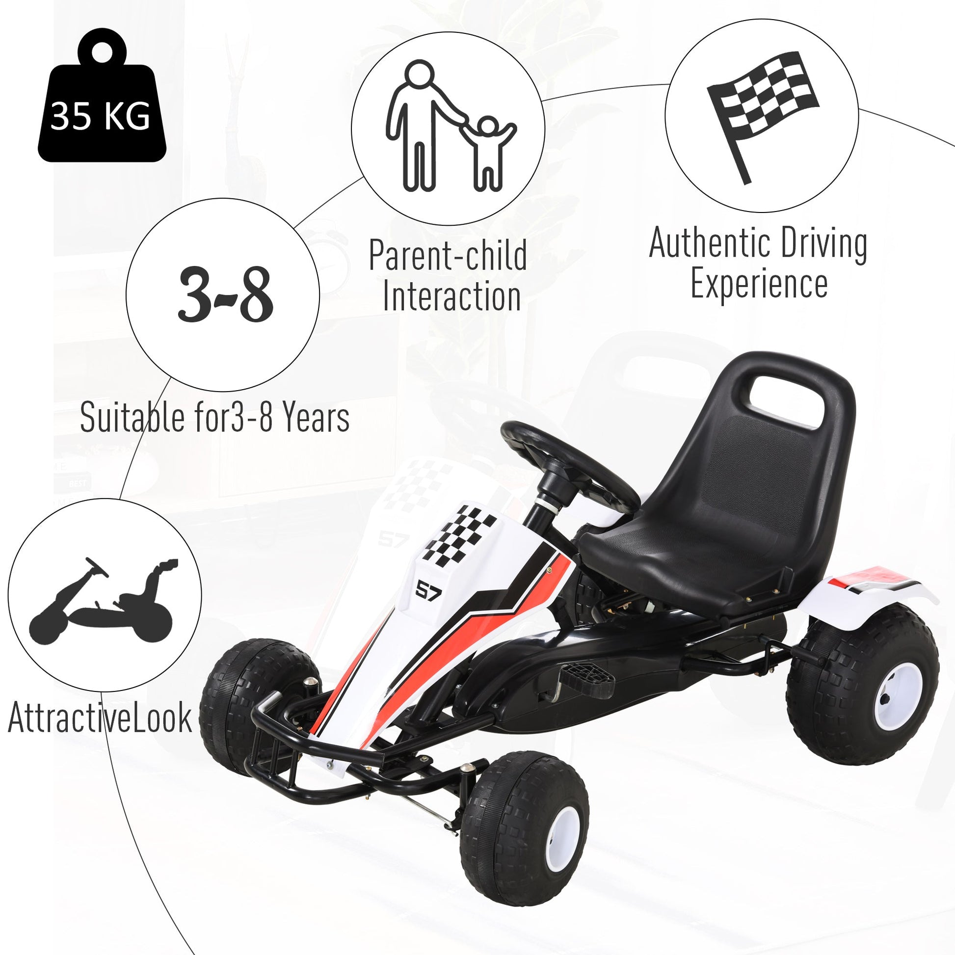Give your child a taste of the real racing experience with this pedal go kart from Homcom. In white, with a cool sticker design on the front, it uses high-quality steel and thick plastic for the frame so it is safe and solid to ride. It's fitted with a wide moulded seat for them to sit comfortably, a large steering wheel and pedal so they are in control of the movement, four plastic wheels for smooth movement and a brake so they can stop immediately. The seat height can be adjusted for a personalised experience, ensuring it is even more enjoyable and comfortable for your little adventurer. Recommended age: 3-8 years.