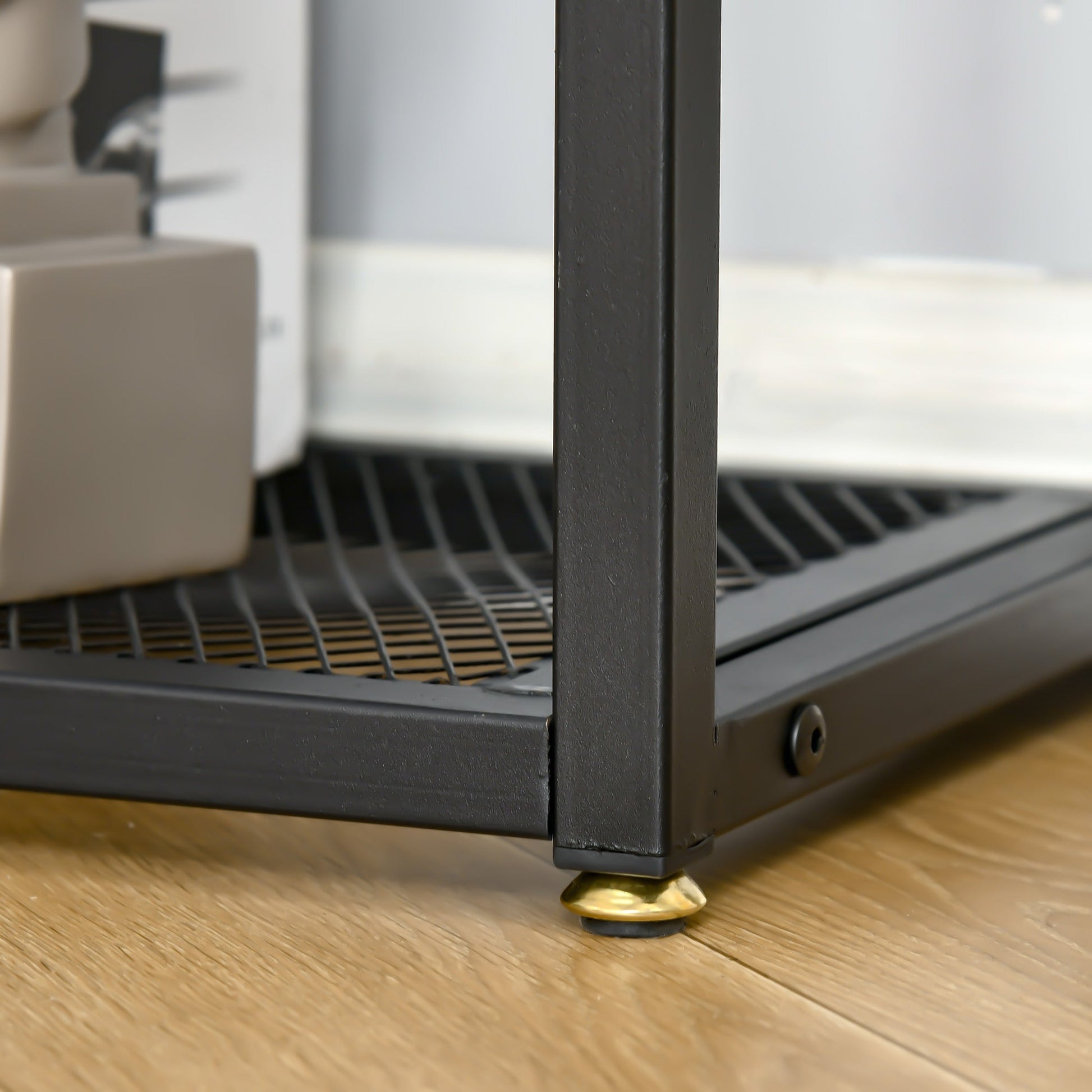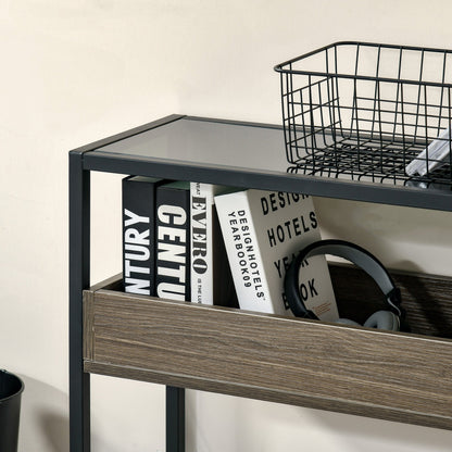 Enhance the living space in industrial style - with this HOMCOM console table. A handy side piece, or use by itself, it comes with three shelves for storage: the middle shelf comes with high sides so nothing falls off or out. Top shelf, made from tempered glass, is strong and impact-resistant - safe, as well as smooth so you can keep it clean easily. The frame is metal for a tough and sturdy structure, finished with adjustable feet for constant balance.