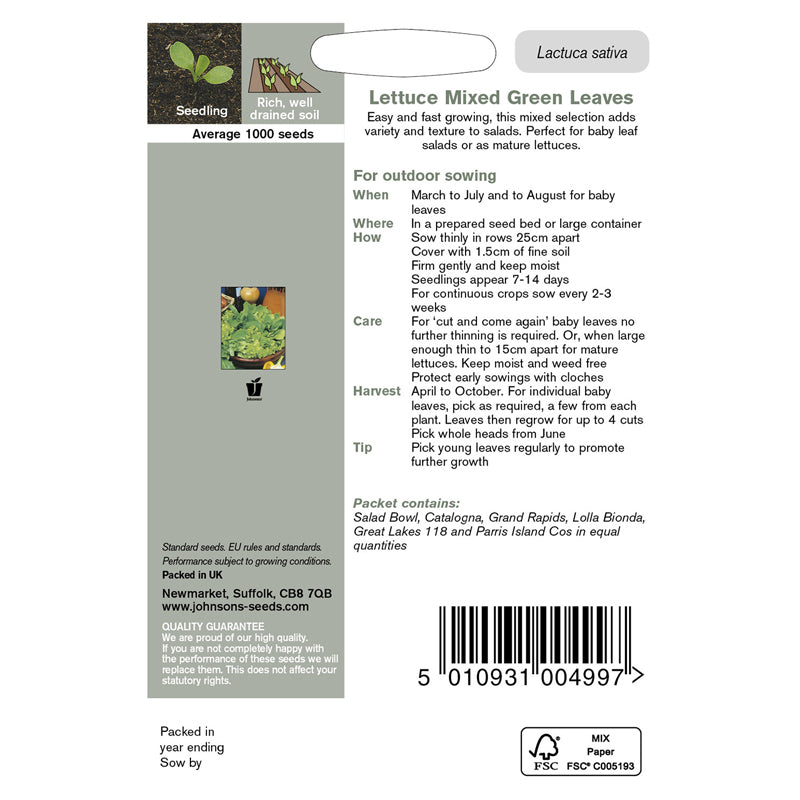 Latin name: Lactuca sativa Johnsons' premium ranges of flower and vegetable packet seeds feature captivating flowers and authentic vegetables from around the world. No matter what the size of your growing space, either a spacious garden or a limited patio, the high quality of Johnsons' seeds cater for any needs.