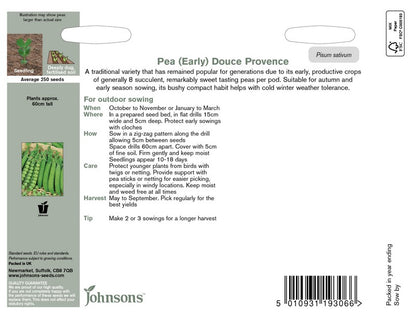 Latin name: Pisum sativum Johnsons' premium ranges of flower and vegetable packet seeds feature captivating flowers and authentic vegetables from around the world. No matter what the size of your growing space, either a spacious garden or a limited patio, the high quality of Johnsons' seeds cater for any needs.