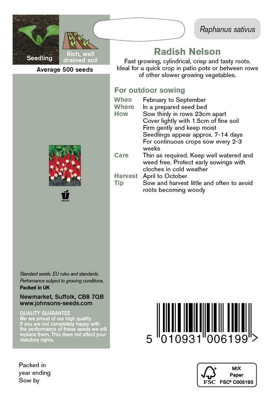 Latin name: Raphanus sativus Johnsons' premium ranges of flower and vegetable packet seeds feature captivating flowers and authentic vegetables from around the world. No matter what the size of your growing space, either a spacious garden or a limited patio, the high quality of Johnsons' seeds cater for any needs.