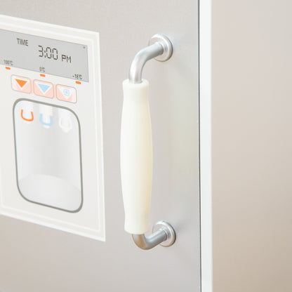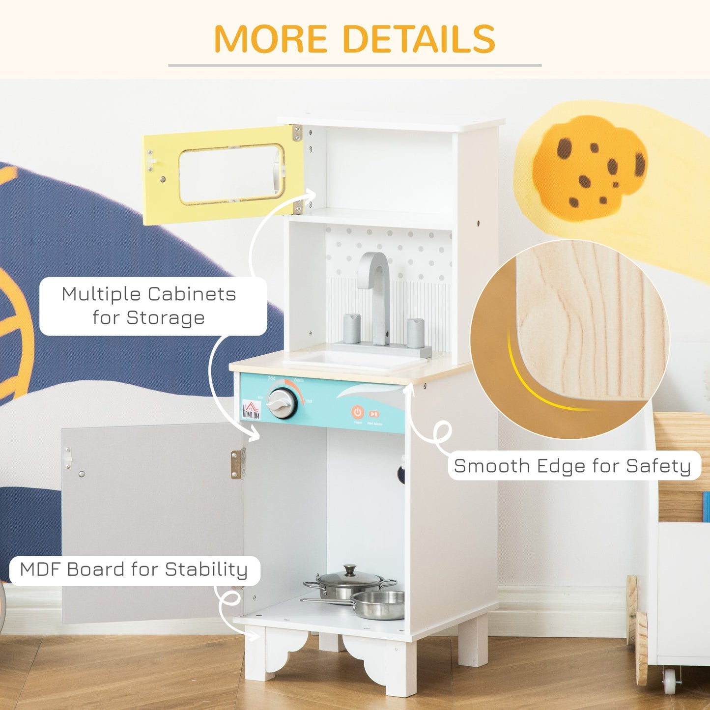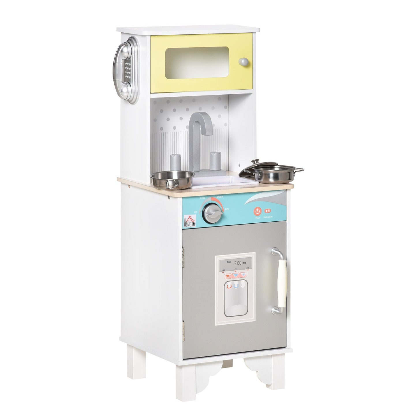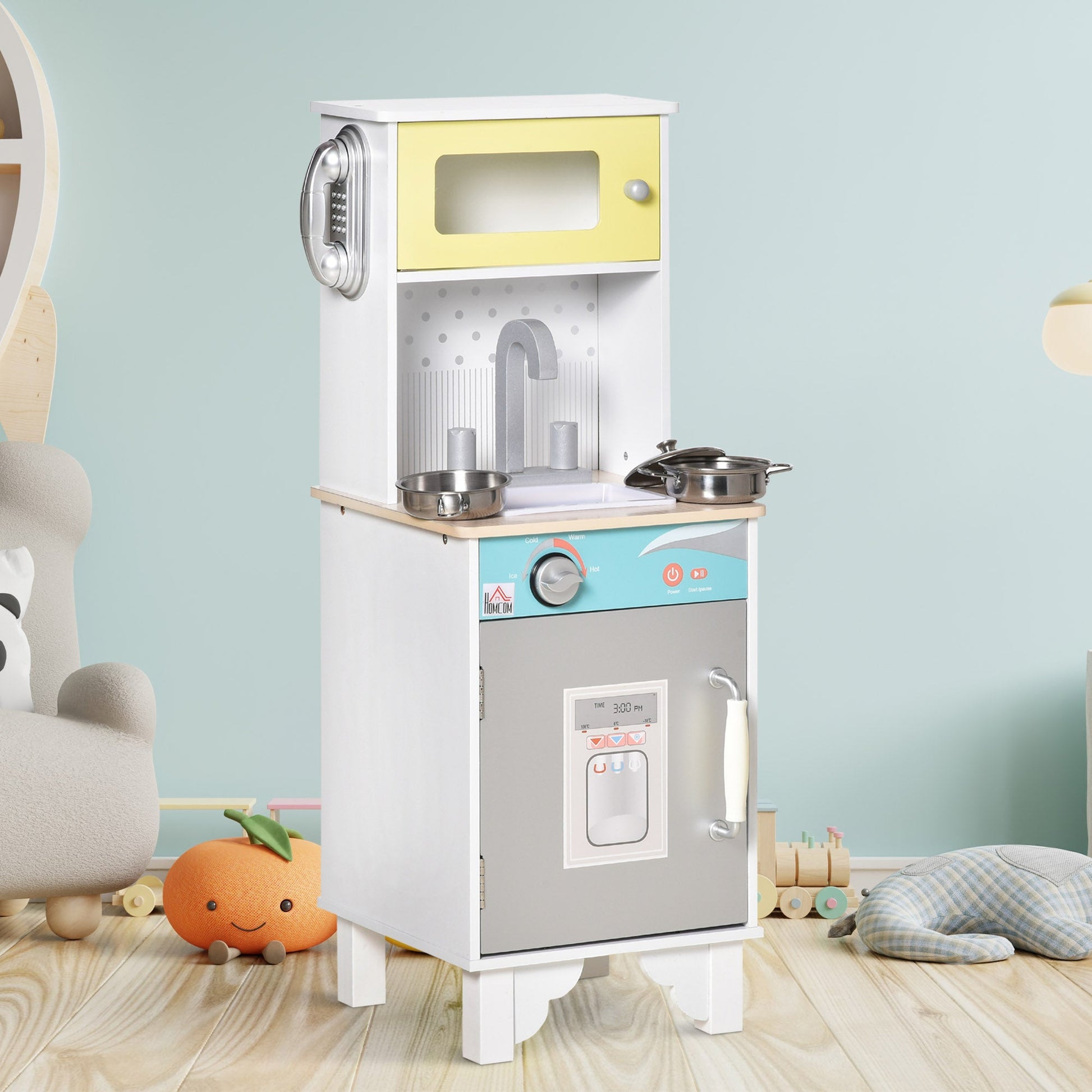 Let your child's imagination run wild with this kitchen set from HOMCOM. With a cooking bench and stainless-steel pans, they'll have everything needed to get their make-believe cooking on. Its compact size doesn't take up much space – suitable for smaller rooms. When playtime is over, store the accessories in the provided cabinets and shelves, keeping your room tidy. They'll be able to play safely, thanks to the smooth and rounded off surfaces that helps prevents accidents.