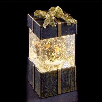 Create a warm and inviting Christmas atmosphere this year with one of these stunning light up animated ornaments. This Christmas decoration will make an eye-catching addition to your living space and brings some festive fun into your home. Celebrate the winter holidays in style with our homely range of Christmas decorations. Please note: This product requires 3 x AA batteries or a DC 5V/300Ma/1.5W transformer which are not included in this set but are available to purchase separately. Features:Illuminated water filled bronze gift box ornament with robins sceneSpinning glitter animationApproximate size: 9.8 x 9.3 x 17.7cmWarm white LED lightingCan be battery operated or mains poweredSuitable for indoor use onlyExplore more of our range, we have a huge variety of products in stock. Have a query or can't find something you're looking for? We receive new deliveries every week, so if the item you wish to purchase is currently out of stock, please contact our Customer Services Team and we may be able to reserve the items you require.