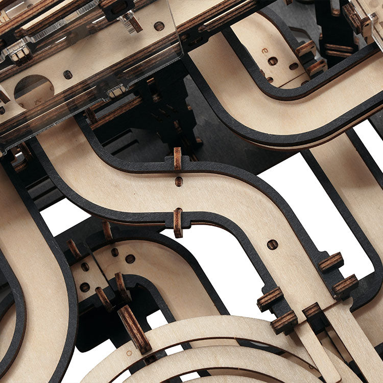 Breakthrough material restrictions and incorporate high-transparent acrylic. With a funnel-shaped track, the total length is extended to 2.5 meters. Rotate the handle, the steel ball will reciprocate along the track to experience the creativity of precision machinery with this wooden marble run puzzle.