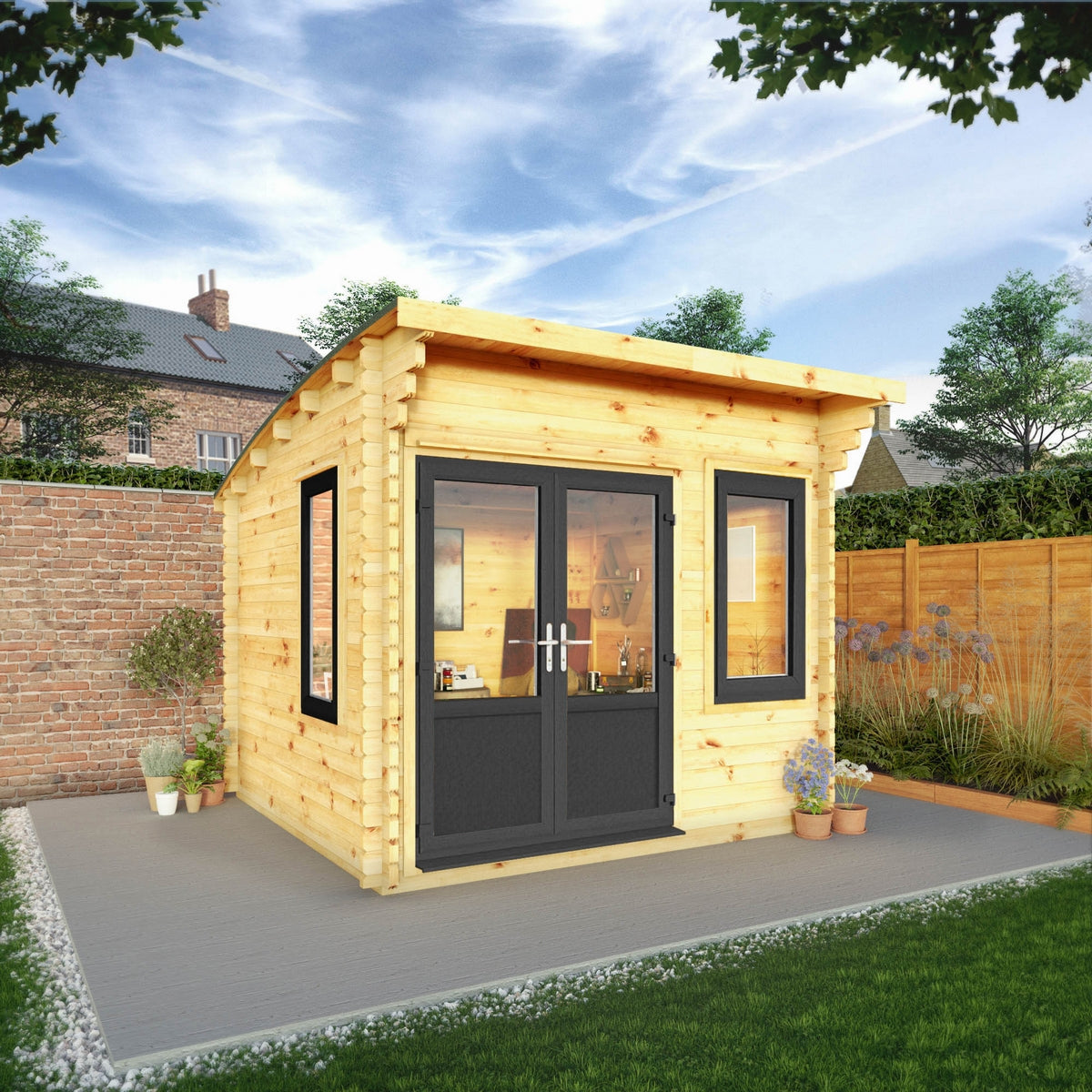 Mercia Helios 11' 5" x 10' Curved Log Cabin - Premium 44mm Cladding Loglap - Grey UPVC