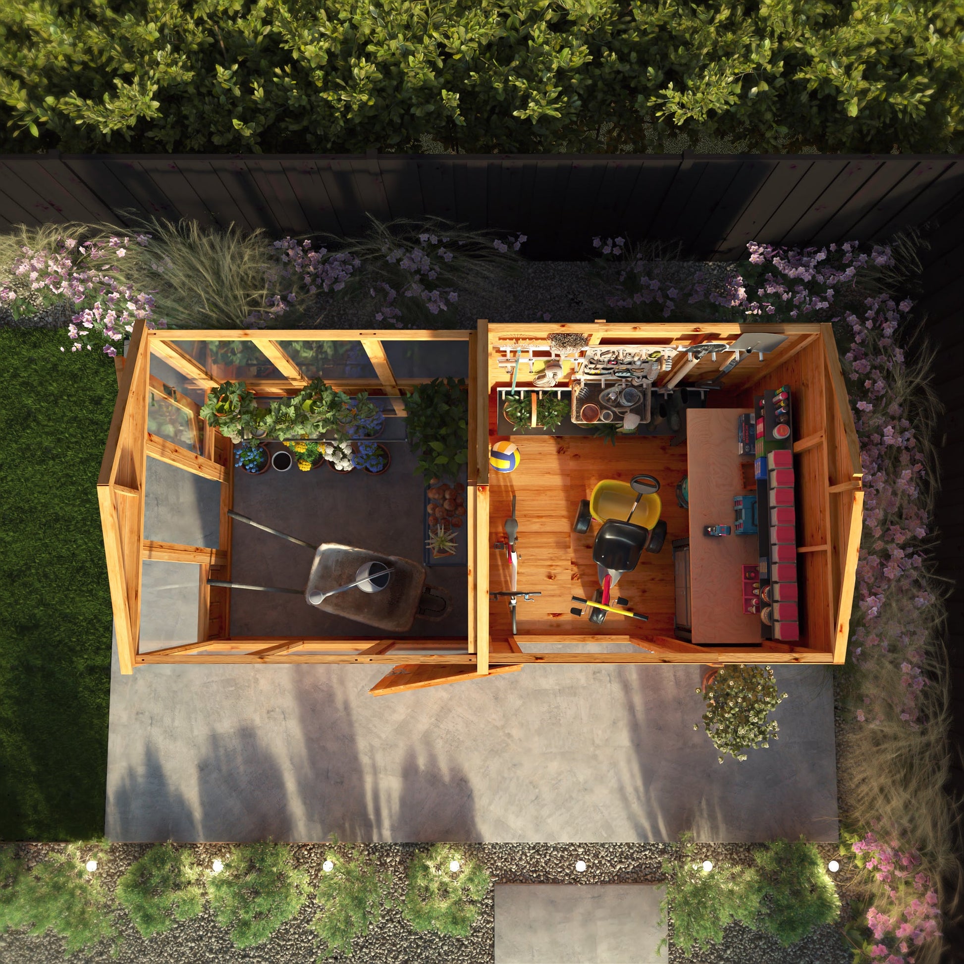 The greenhouse section is designed to create an optimal environment for plant growth, with an opening roof vent to improve airflow and regulate the temperature inside. The shed section provides valuable storage space for your garden tools, pots, and other essentials, helping to keep your outdoor space neat and organised. The high-quality ironmongery adds a touch of traditional style, while the watertight shiplap cladding ensures that both the greenhouse and shed areas are protected from the elements.