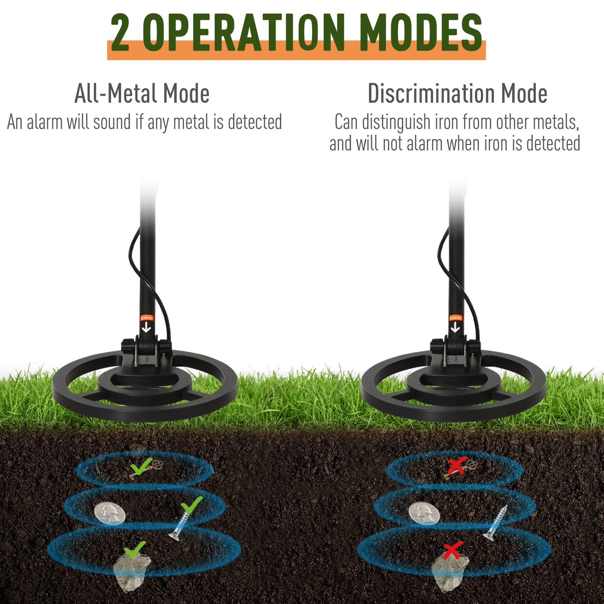 - Two operation modes: all-metal mode & discrimination mode