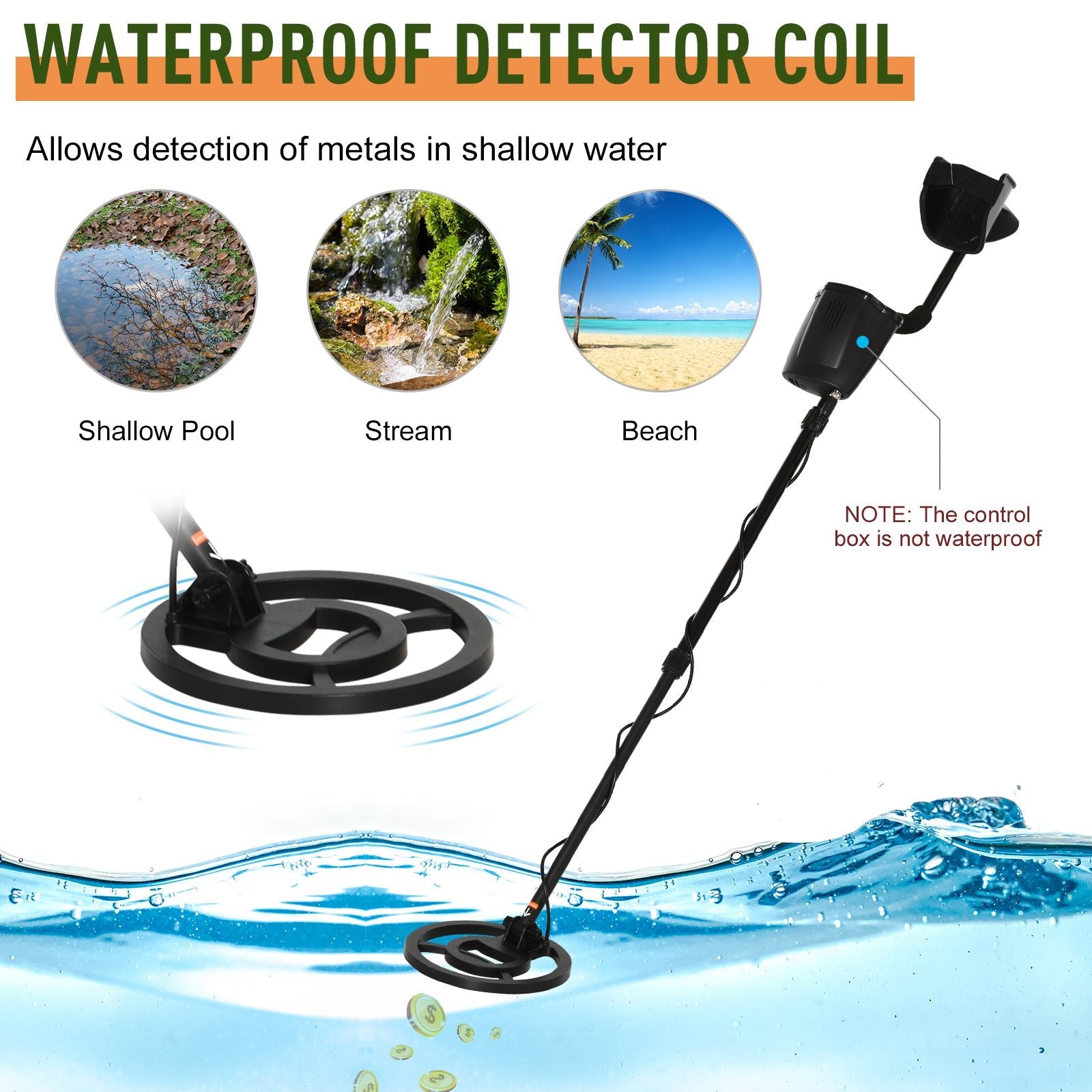 - Water-resistant search coil enables you to search for lost metal items in a shallow pool or stream