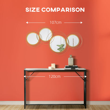 Decorative and functional - what's not to like with this mirrored wall art from HOMCOM? Here this piece features four mirrors for plenty of reflection - each framed with cut-out asymmetric circular pieces fixed together; covered in a gold-tone finish for a brush of glamour. A metal structure for lasting strength, this mirror features hooks on the back to attach to surfaces with ease - comes with a hanging kit so you have everything you need to use straight out the box.