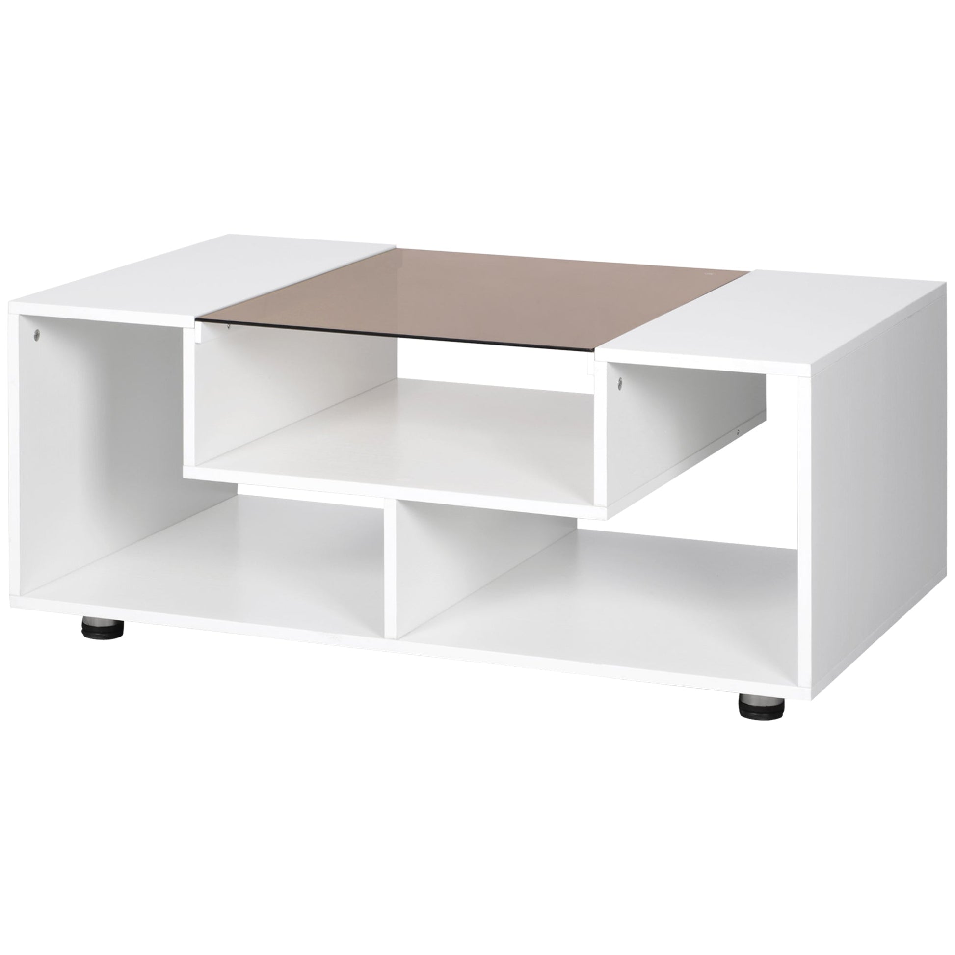 Minimal furniture, with a touch of modern - this HOMCOM coffee table. It comes in a white design, fitted with a brown tinted glass panel which gently breaks it up for a modern feel. Three compartments below the table top for plenty of storage and display space. Made from particle board for durability, it's finished with foot pads to gently protect the floor.