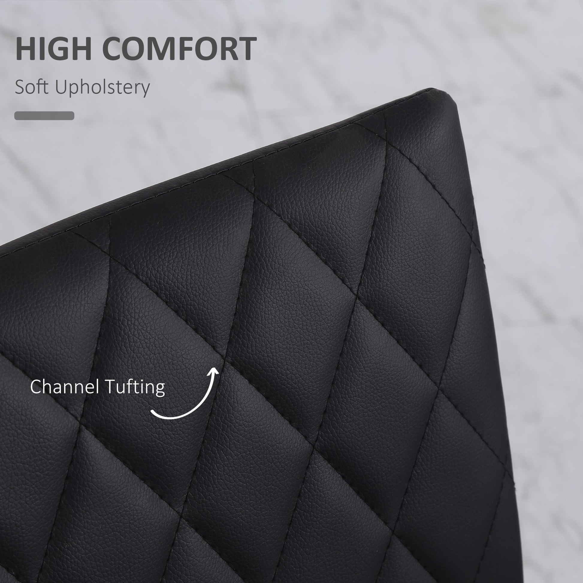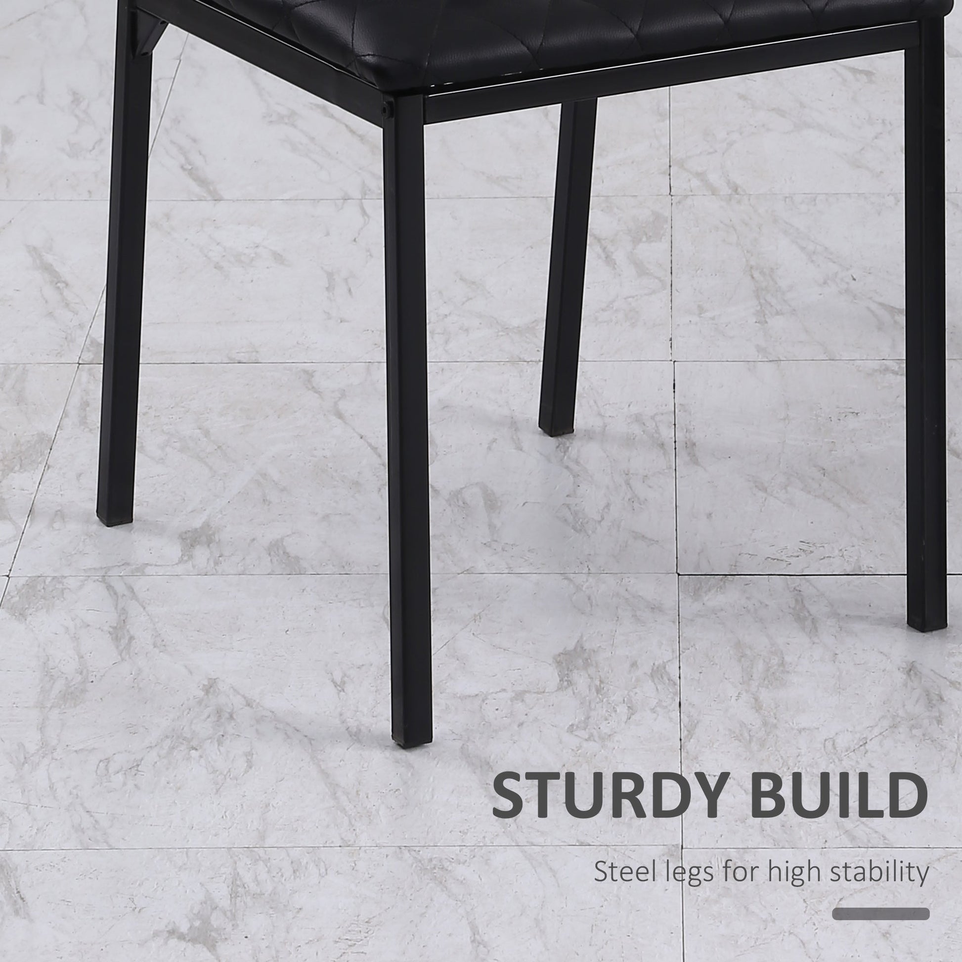 Sleek and simple style, with a small stand-out point: these dining chairs from HOMCOM. Each is wrapped in PU leather, with covered in a diamond-shaped pattern for extra flair. Seat is filled with cushion for comfort, whilst the high back offers support. The powder coated steel legs are strong, so they keep you fully supported when sitting. Set of four for a matching look in your dining and kitchen areas.