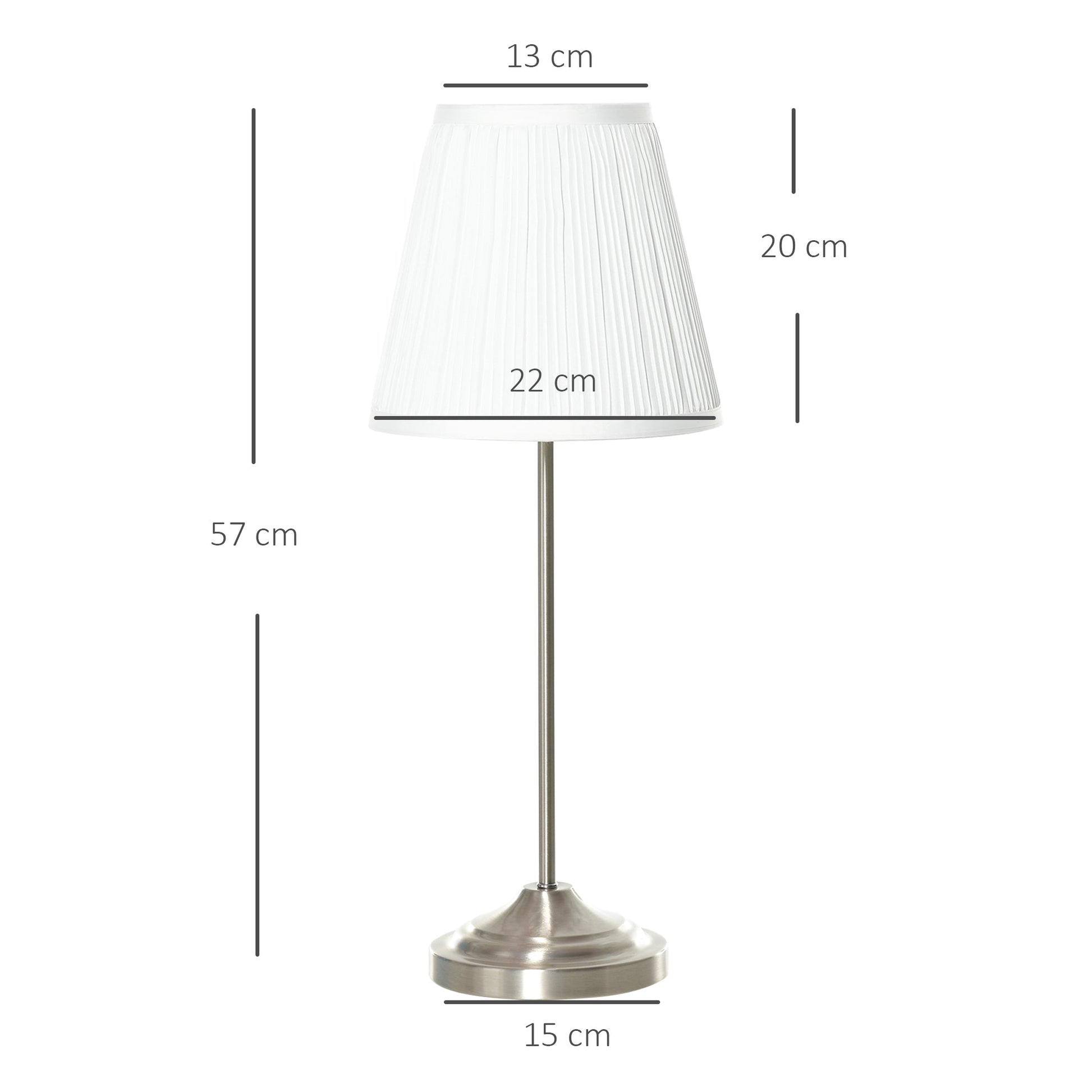 Light up the bedside table in simple style with this small lamp from HOMCOM. A steel frame for a sturdy core structure, it is finished in a dark silver colour for plain versatility. The round base keeps it balanced. A classic trapeze-shaped lampshade is placed on the top, which is pleated all over for an elegant contrast to the smooth finish of the frame. The pale colour of the shade allows the light to diffuse out a soft illumination, creating a soft and welcoming atmosphere in the evenings and night times. Finished with a rocker switch to turn on and off easily.