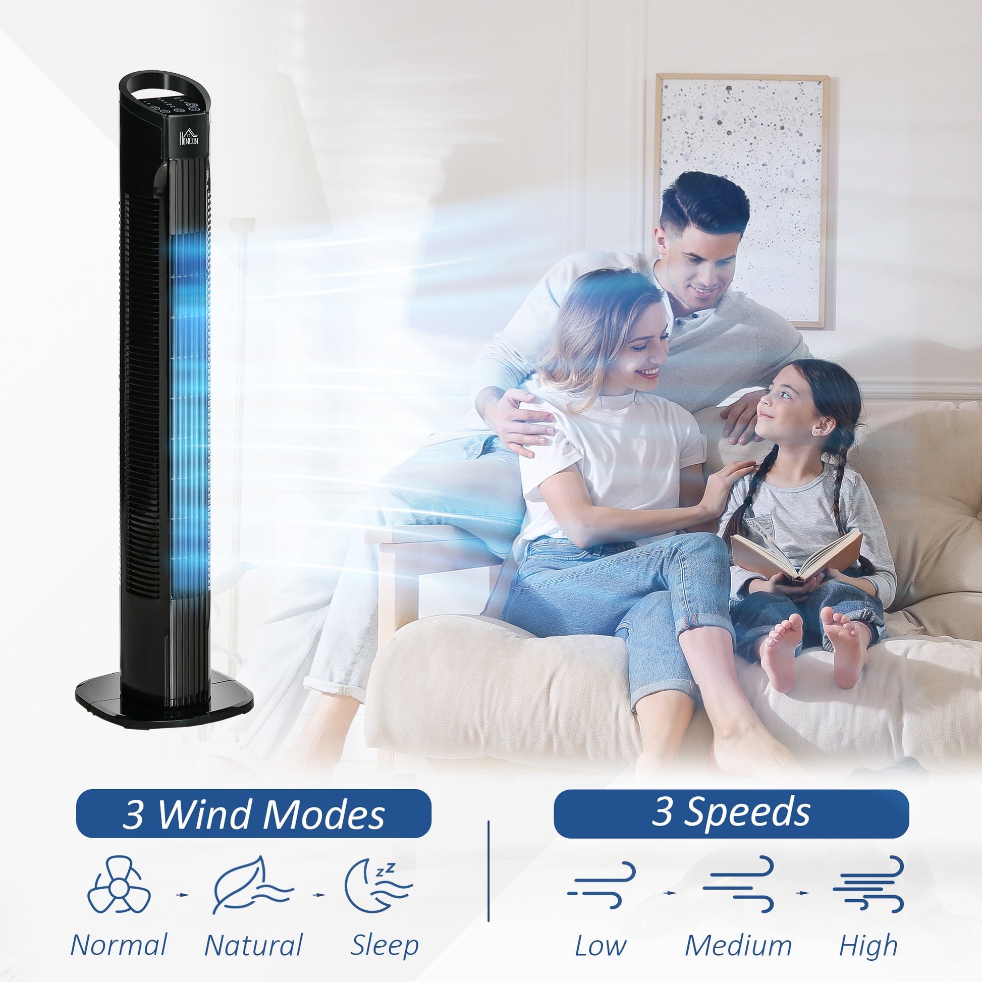 - Modern look freestanding tower fan fits living room, bedroom, office using