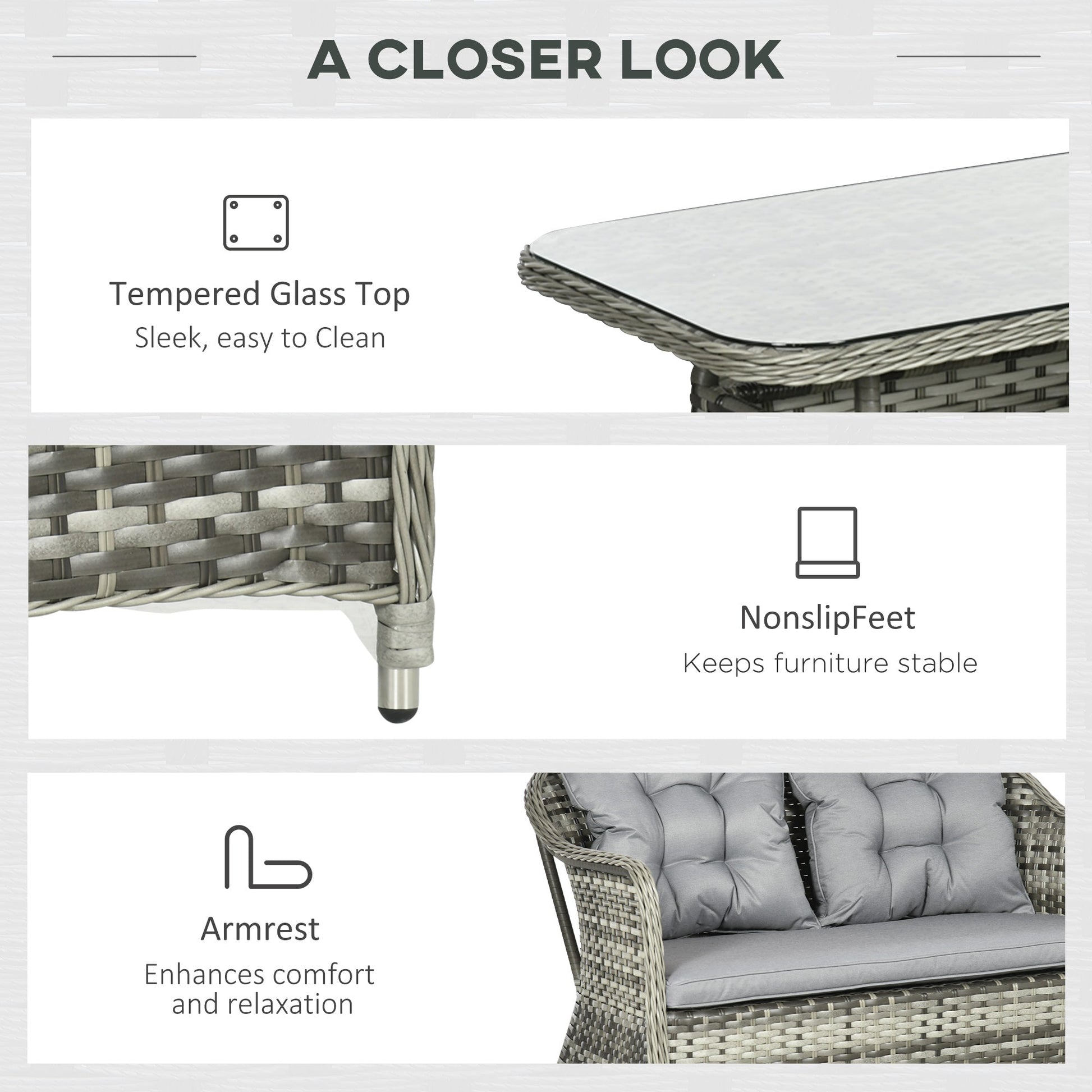 Look forward to those lazy afternoons ahead with this outdoor seating set from Outsunny. Totalling four pieces, the set includes two armchairs, a loveseat and a matching coffee table, with lightweight aluminium forming the base frame for a robust structure. Matching in height with the chairs, the table is the perfect spot for keeping everything you need near, with beautiful glass surface placed on top. A set to relax under the sun for seasons to come.