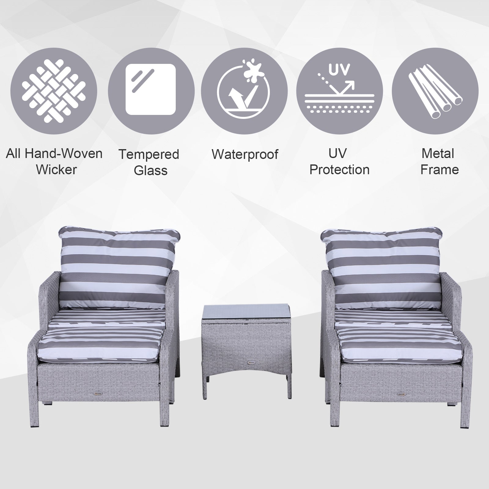 - Weight Capacity: 160kg (armchair), 70kg (ottoman), 30kg (table)