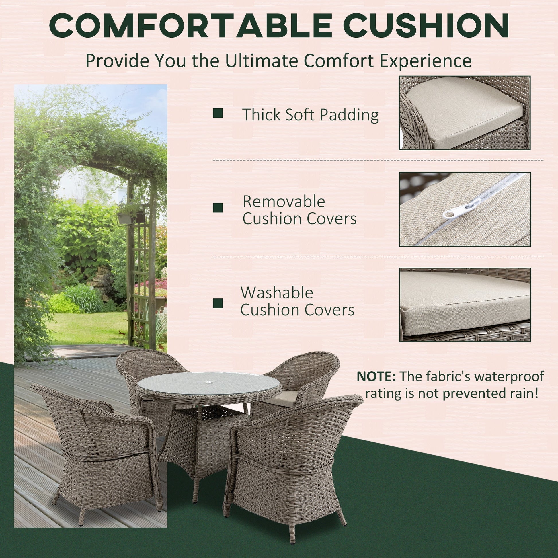 Gathering guests around this season, and beyond, don't come as stylish as this. The garden sofa dining set pairs a sleek glass-top table with on-trend mixed grey rattan for a welcome addition to your garden and outdoor areas. Comes with four armrest chairs, each with a padded seat cushion for comfort and high back and armrests for support. The middle hole in the table of the rattan garden dining set offers a place for a parasol to keep you safely shaded. Relax in comfort and style with Outsunny.